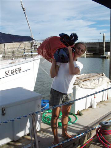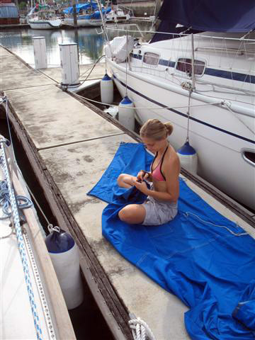 Janička se ještě pustila do zašívání plachet proti slunci a dešti, které jsme nařezali a v jistých případech přímo natrhali ze starého plachty, která původně zakrývala celou loď. Já jsem začal rozebírat rolfok Harken, protože jsme potřebovali změřit velikost Sta-Loku, takového mechanického ukončení ocelového lana, které drží stěžeň ve vzduchu.
