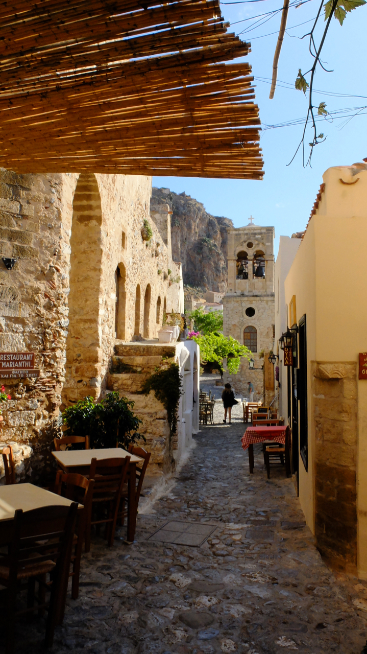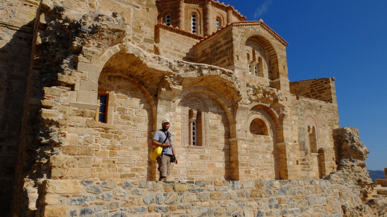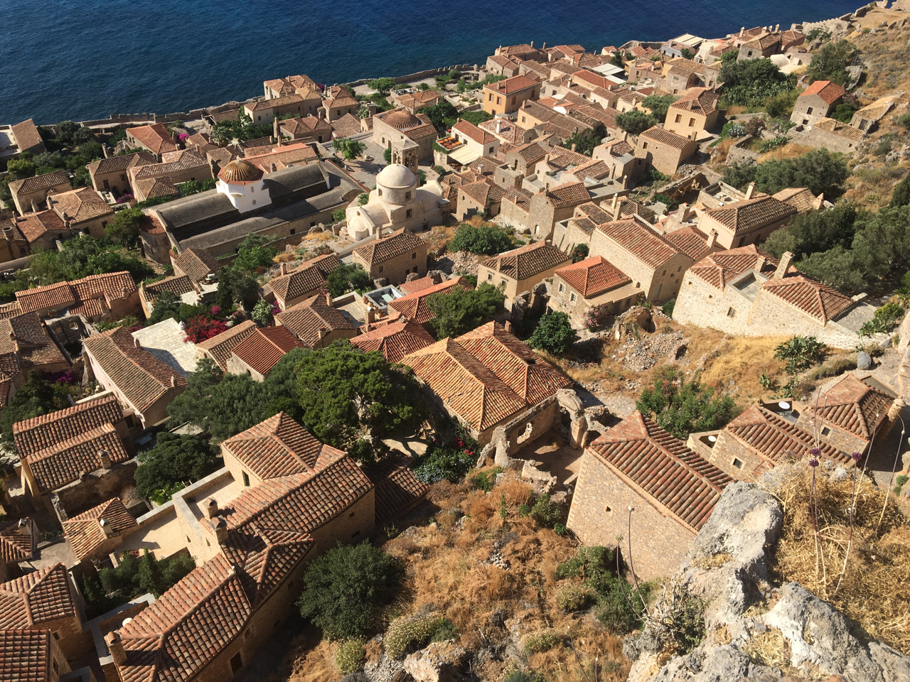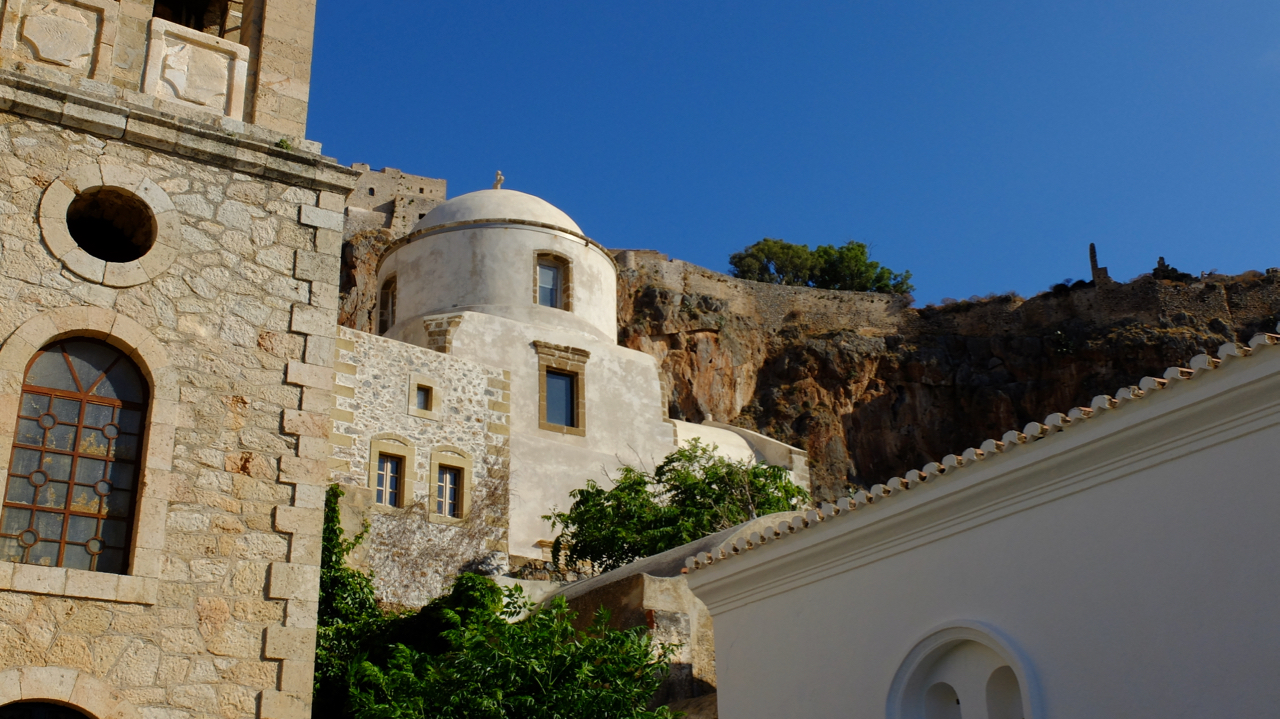 Původní osídlení Skály se datuje do pozdní doby bronzové, ale pravá sláva začíná až po pádu Římské říše, kdy bylo na na Skále založeno byzantské město. A vzhledem k tomu, že město na Skále je prakticky nedobytné, jak vám napoví jediný pohled na ní – Skála je spojena s pevninou jediným mostem a jinak se prostě na ní dostat nedá – byla její historie patřičně pestrá. Byzanc střídali Turci, ti pak byly vyhnáni Benátčany, aby se po čase vrátili, chvíli patřila Monemvassia papeži, ale pak ji radši předal zase Benátčanům, a tí zase Turkům. Teprve od nezávislosti Řecka je Skála řecká. Staré město, krčící se na jejím úpatí a nad mořem je doposud obydlené a stojí za návštěvu. Je opravdu malebné. Uzounké uličky přilepené na svahu hory si zachovaly středověký ráz, jakoby se ani nepsal rok 2018. Pár turistických obchůdků a restaurací najdete hned dole, ale jakmile vyrazíte směrem do kopce, přenesete se v čase o mnoho století zpátky. Statečně jsme s Jirkou vystoupali až na vrchol skály, kde leží pravoslavný kostel a zbytky celého sídliště budov, které na vrcholu kdysi stály.