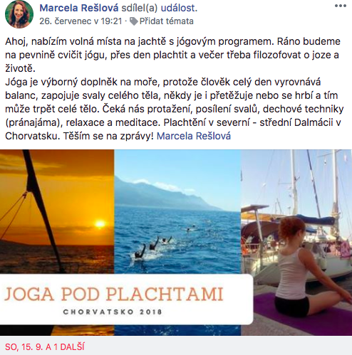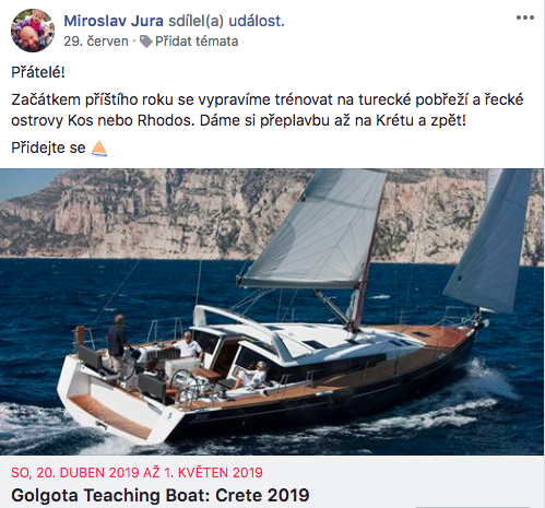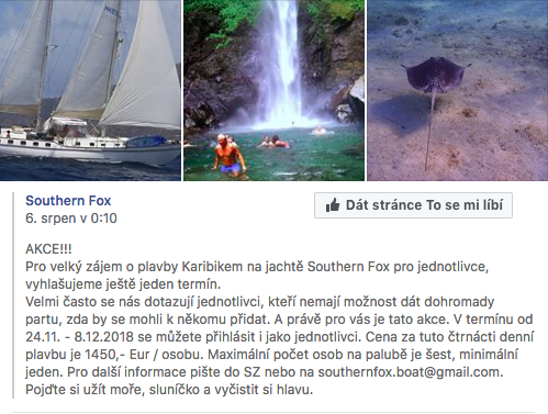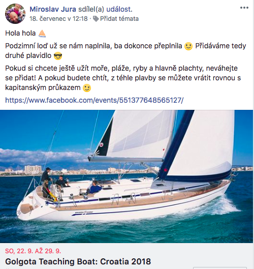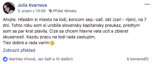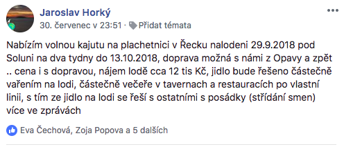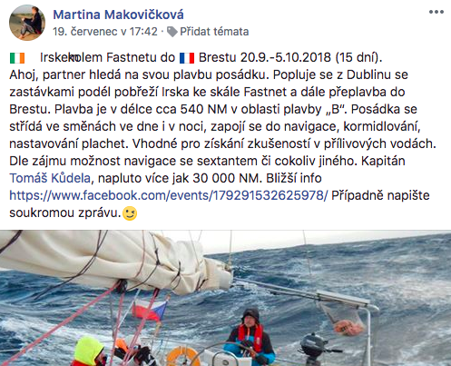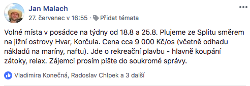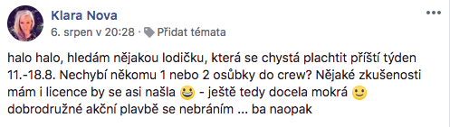 Hledali jsme cestu, jak čtenářům Krásy jachtingu, kteří neholdují Facebooku, zpřístupnit informace z facebookové skupiny Krása jachtingu: Hledám posádku nebo loď. Jediné, co se zatím ukazuje jako zvládnutelné, je vkládání kopií jednotlivých inzerátů. Tak uvidíme, jak se to osvědčí. V těch inzerátech jsou většinou uvedeny kontaktní informace přímo, pokud tam nejsou a moc vám na nich bude záležet, zkuste napsat nám do redakce, my oslovíme dotyčného přímo. (A nebo si udělejte profil na Facebooku 🙂 ).