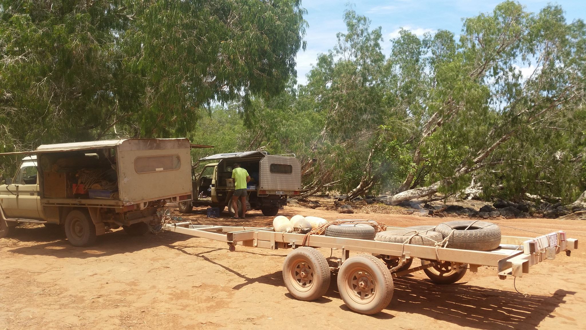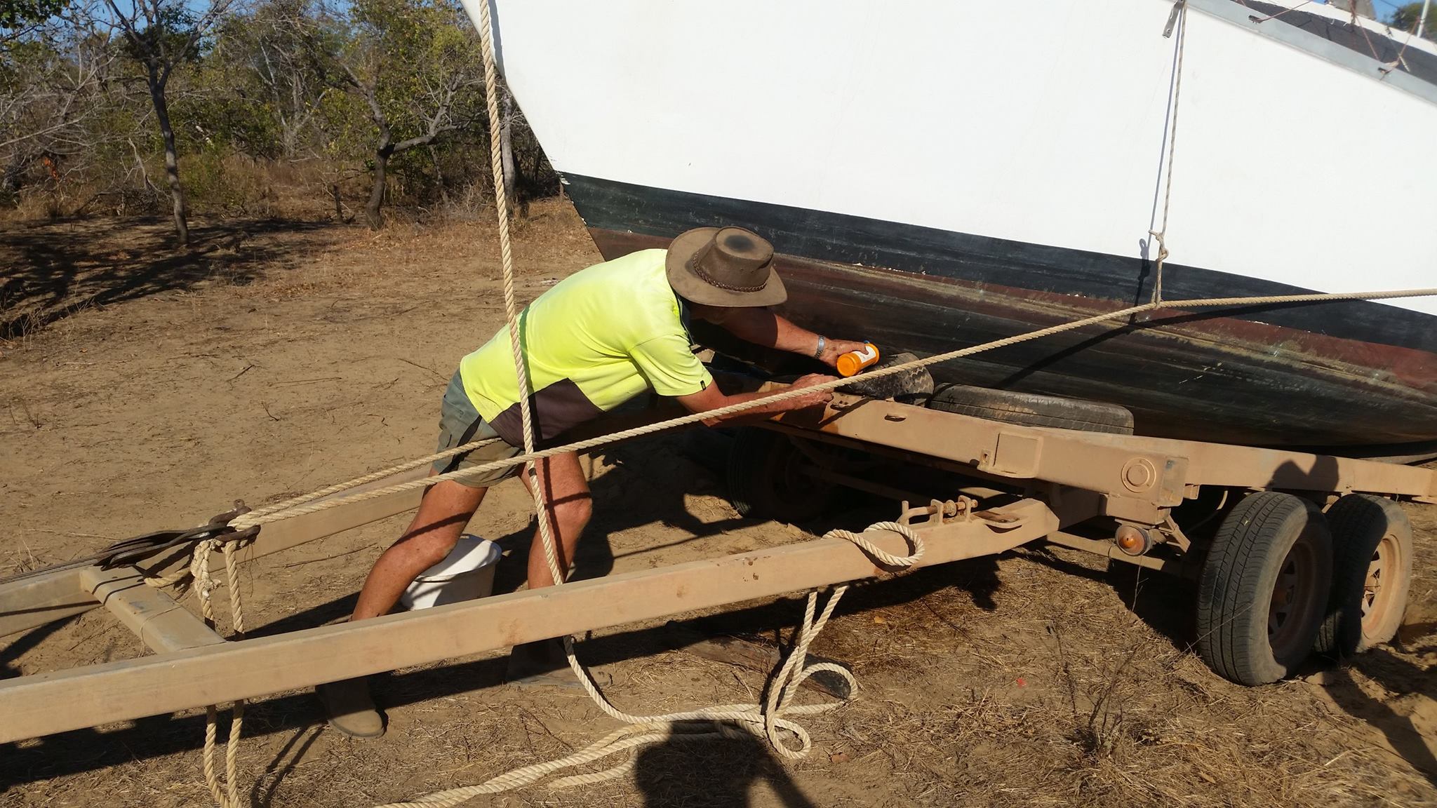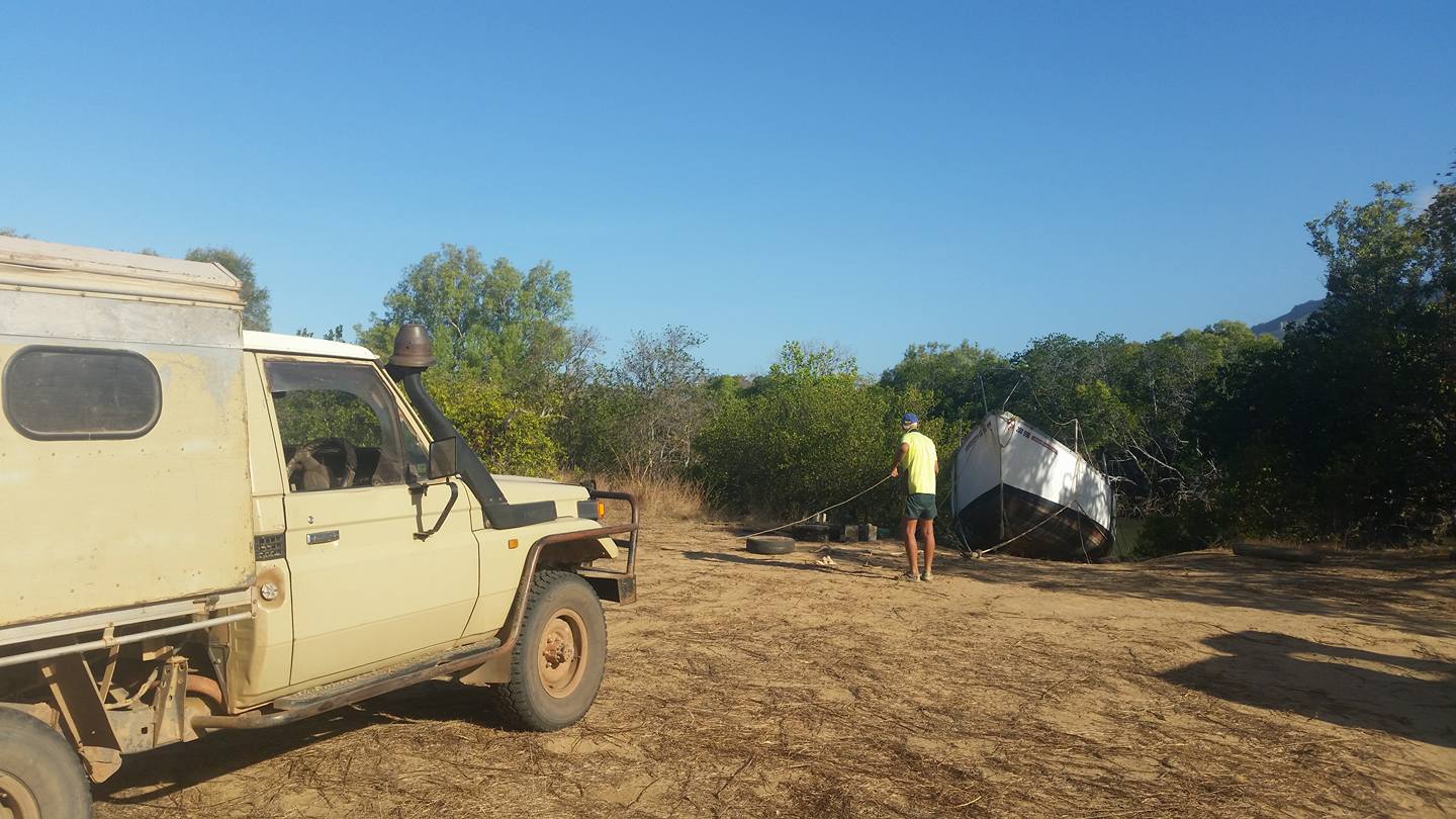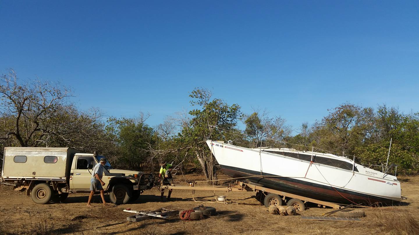 „AHOJ! Máme pět ráno, vaříme na ohni čajíček. Udržovali jsme ho přes noc. Teď budeme bourat. Vítr ustal a začalo tu být dost živo. Být tu třetí den je prý už riskantní – krokodýli by mohli v noci zaútočit. V noci vidíme v dálce záři ohňů – to hoří buš. Naložíme Toyotky, zapřáhneme vlek s kýlem a stěžněm a vyrazíme, dřív než začne pršet a uzavřou se cesty. Alya je připravená k naložení, ale musí tu ještě chvíli počkat – musíme sehnat větší vlek. Pak se pro Alyi vrátíme – je to jen 250 km! Pošlu fotky. Není ještě vyhráno, ale dědečci jsou skvělá operační jednotka pro tuto misi!„