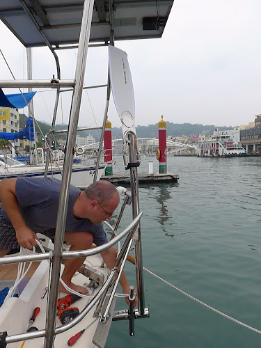 Ve středu dopoledne dočistil Péťa spodek lodního kýlu, navrtali a přišroubovali jsme panty k našemu novému víku v kokpitu a po obědě se vydali na úřady. Sotva jsme dorazili na kapitanát, zatáhlo se a spustil se pořádný tropický liják. Pan Jang nejprve nemohl najít ve svém počítači informace o naší lodi, načež jsme se vzápětí dozvěděli, že podle jejich údajů je majitelem Janny jakýsi Li Cung-lin… Příjezd do Kaohsiungu nám před dvěma lety pomáhal zařizovat známý a očividně došlo k nejednomu přehmatu. Nakonec jsme po téměř hodině a půl odcházeli s příslibem, že systém, pomocí kterého se mohou lodě se zahraniční registrací sami přihlásit a ohlásit z přístavu, už opět funguje a ať si zkusíme vyřídit port clearance sami večer doma přes internet. Zbytek pochůzek po úřadech již proběhl bez větších komplikací a před setměním jsme ještě stihli převézt na loď další várku zásob a nainstalovat novou pumpu na mořskou vodu, která chladí motor a která přišla v pondělí z Anglie.