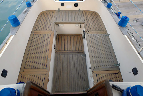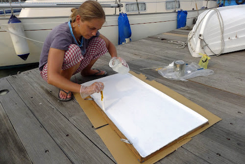Začalo to vlastně už na začátku března, kdy jsem i já konečně odevzdala disertaci a vrhli jsme se do dalších velkých oprav a úprav na Janně, kterou jsme kvůli studiu poslední dobou tak trochu zanedbávali. Měsíc a půl jsme prakticky každý den chodili na loď, někdy jen na odpoledne, ale většinou na celý den a kromě kratičké přestávky na oběd, který se sestával z krajíce našeho domácího chleba se sýrem a termosky čaje, dřeli od rána do večera, kdy jsme unavení nasedli na náš skútr a po večeři si to namířili rovnou do postele. Postupně jsme očistili a zabrousili staré týkové plaňky z podlážky kokpitu, které jsme před třemi lety museli kvůli shnilé dřevotřísce pod nimi strhnout, vyrobili sklolaminátové víko pro nový úložný prostor, na který jsme plánovali předělat zadní lůžko, připravili a epoxidovou pryskyřicí natřeli nové dřevotřískové desky, kterými jsme vyrovnali podlahu v kokpitu před nalepením týkových plaňek a na dvakrát dokoupili v loděnici na předměstí těch pár týkových prkýnek, které nám chyběly. Následovalo třífázové lepení – nejprve dřevotřískové desky na srovnání podlážky v kokpitu, potom týkové plaňky na dřevotřísku a na závěr zatmelování spár mezi plaňkami. Mezitím jsme odstranili starou dorádu (průduch) a zalepili díru po ní, za týden navrtali o kousek menší díru a naistalovali dorádu novou. Další položkou na seznamu byla montáž větrného autopilota Cape Horn, výroba dřevěných podpěr na uvazování člunu na střeše kajuty během plavby, přelepování jména lodi (od nového roku jsme museli změnit registraci do Německa) a spousta dalších drobných úprav.