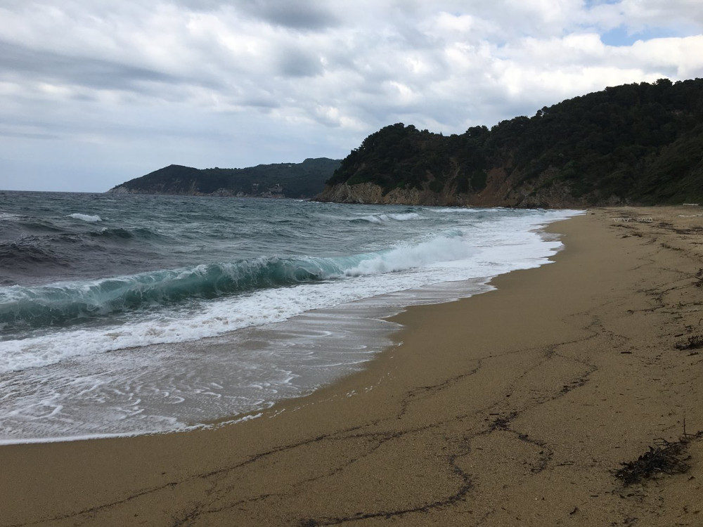 Počasí se kazí. Velmi brzy ráno vyrážíme z Patitri na Skopelos. Fouká docela slušně a tak plujeme šest uzlů i na zrefované plachty. Oběd si dáváme na pláži Mamma Mia na západní straně Skopelosu a pak opět na plachty dorážíme na Skiathos.