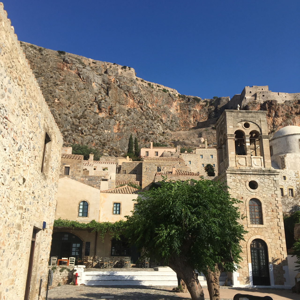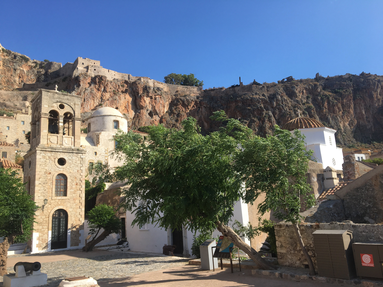 Původní osídlení Skály se datuje do pozdní doby bronzové, ale pravá sláva začíná až po pádu Římské říše, kdy bylo na na Skále založeno byzantské město. A vzhledem k tomu, že město na Skále je prakticky nedobytné, jak vám napoví jediný pohled na ní – Skála je spojena s pevninou jediným mostem a jinak se prostě na ní dostat nedá – byla její historie patřičně pestrá. Byzanc střídali Turci, ti pak byly vyhnáni Benátčany, aby se po čase vrátili, chvíli patřila Monemvassia papeži, ale pak ji radši předal zase Benátčanům, a tí zase Turkům. Teprve od nezávislosti Řecka je Skála řecká. Staré město, krčící se na jejím úpatí a nad mořem je doposud obydlené a stojí za návštěvu. Je opravdu malebné. Uzounké uličky přilepené na svahu hory si zachovaly středověký ráz, jakoby se ani nepsal rok 2018. Pár turistických obchůdků a restaurací najdete hned dole, ale jakmile vyrazíte směrem do kopce, přenesete se v čase o mnoho století zpátky. Statečně jsme s Jirkou vystoupali až na vrchol skály, kde leží pravoslavný kostel a zbytky celého sídliště budov, které na vrcholu kdysi stály.