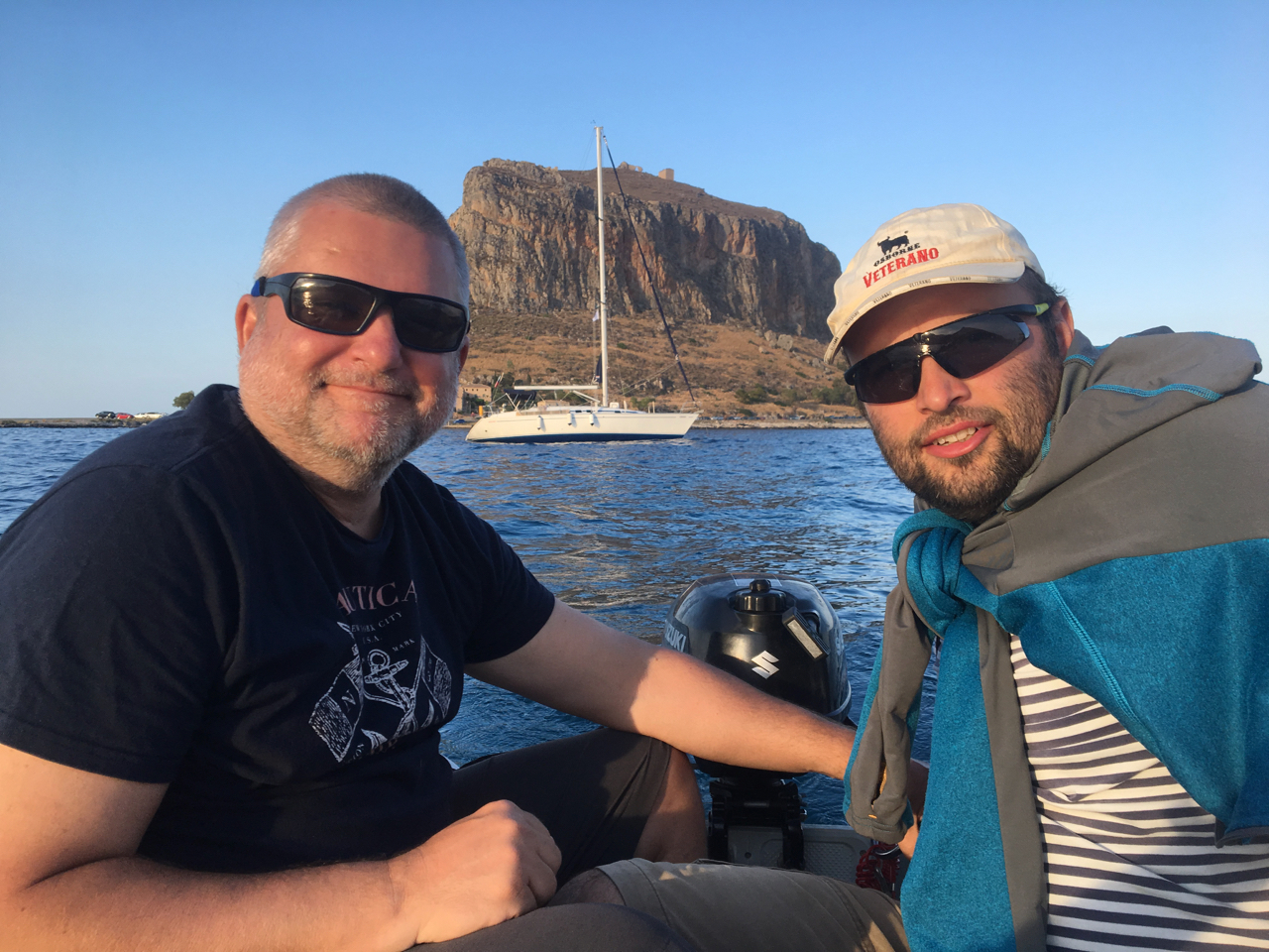 No. Noc stála také za to. Vítr a vlny od východu nás na kotvišti honily celou noc sem a tam, kotevní alarm neustále ječel a tak jsme se vyspali dohromady sotva dvě hodiny. To nás ovšem neodradilo provést druhý den ráno výsadek na monemvassiskou skálu.