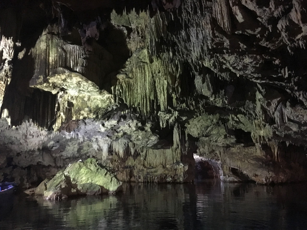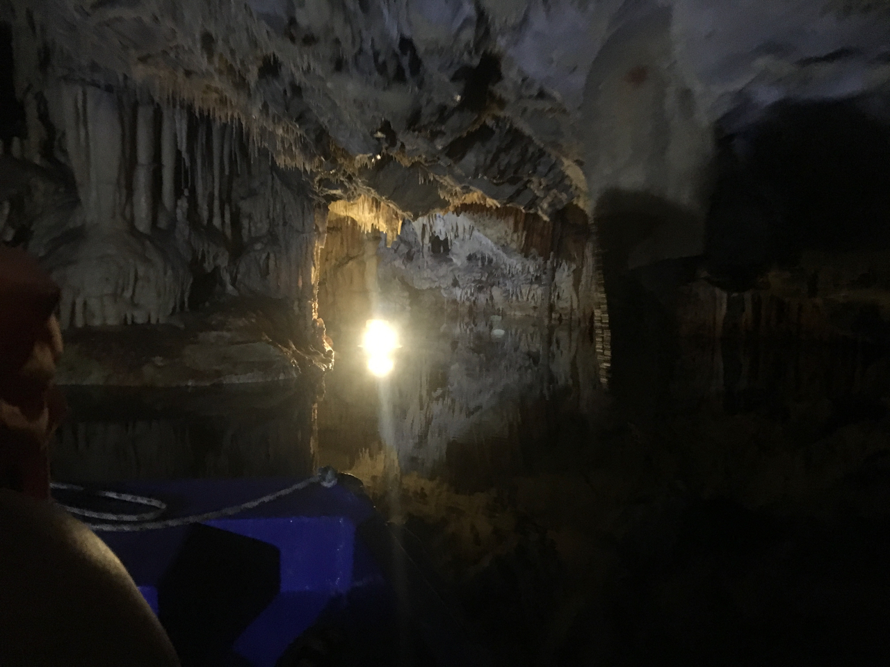 Druhý den, na MDD, jsme dopoledne ještě zaskočili o zátoku jižněji, do místa s proslulou, zatopenou krápníkovou jeskyní. Jde o systém krasových kanálů v nitru hory, kterým lze proplouvat na lodičce – jedná se o placenou prohlídku, 13 EUR osoba. Ale stojí to zato. Viděli jsme už dost krasových systémů, od Macochy po Postojanské jamy ve Slovinsku, ale tohle byl také vynikající zážitek. Celé to trvá asi 45 minut a jestli někdy v kraji Mani budete, nevynechejte.