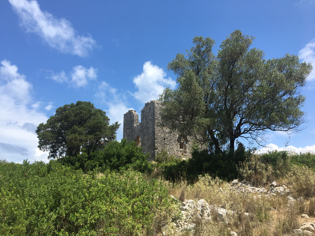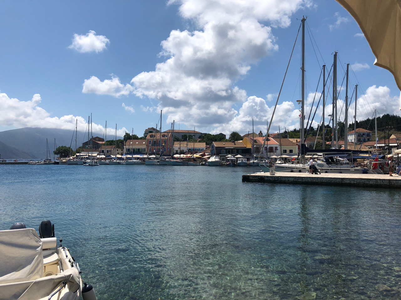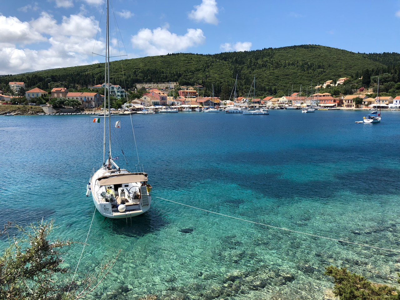 V našem prvním cíli, Fiskardu, jsme lehce poobědvali, prošli se k benátskému majáku, který stojí na poloostrově a prozkoumaly kotevní možnosti zátoky. Fiskardo je jediné město, které uniklo zničení v roce 1955, údajně proto, že stojí na pružném podkladu a tak otřesy nebyly tak ničivě. Díky tomu jsou domy ve Fiskardu původní, opečovávané a velmi malebné. Přístav, spíše tedy přístavek, je oblíbeným cílem jachtařů, takže je tu po plavební stránce značně rušno.
