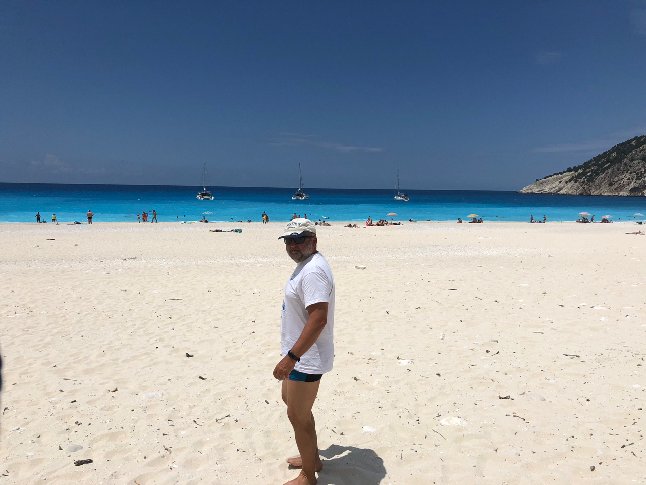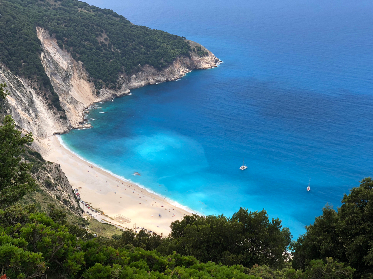 Cestou z Fiskarda na Argostoly jsme samozřejmě nemohli minout Myrtos beach – nádhernou pláž zařízlou do západního pobřeží Kefalonie, kde se natáčely některé scény z Mandoliny kapitána Correliho. Přesněji ta s prostitutkami a odpálení miny. Byly pěkné vlny, a tak jsme si i zablbnuli.