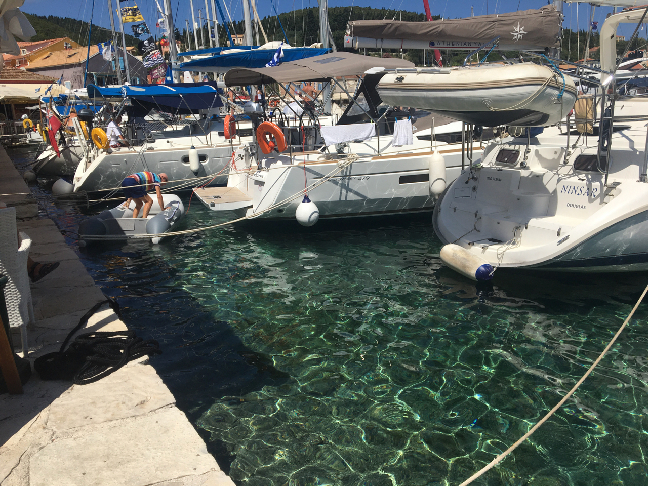 Malá zátoka na sever od Sami. Podél mola stání kotva břeh. V neděli dopoledne obsazeno, skoro celé flotila Sailing Holidays. Možnost hodit kotvu v bazenu.