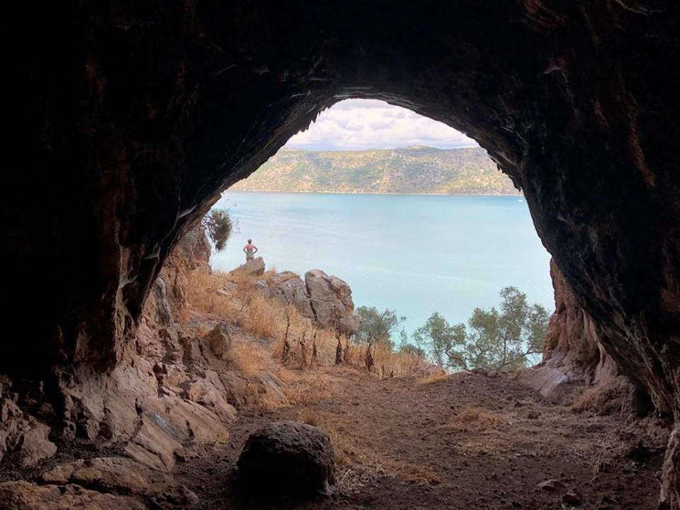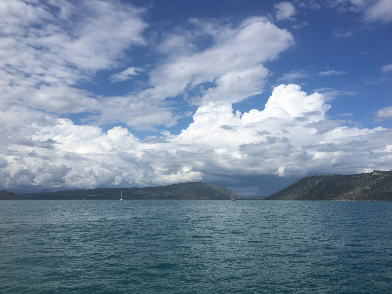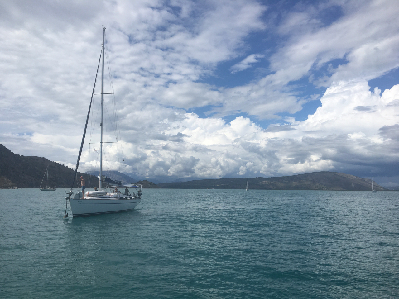 Další den se nad nás nasunul střed tlakové níže – bylo to jak z učebnice. Slabý vítr ve středu a všude okolo fronty mraků. Nicméně jsme využili slabý severní až severozápadní vítr a velice pěknou plavbou na plachty jsme z kefalonského Sami vyrazili na východ, s cílem zakotvit v zátoce Petala u ostrova Petalas. Průvodce sliboval kryté a klidné kotviště. A skutečně. Za ostrovem Petalas se rozkládají rozsáhlé mělčiny a mokřiska, v jejichž jižní části se dá velmi dobře kotvit. Zátoka, nebo možná spíše záliv, je krytá ostrovem a pevninou, je veliká a na dně je písek s bahnem. Navíc leží mimo charterové trasy, a tak tam kotvilo jen několik majitelských lodí. Magické místo je navíc zpestřené jeskyní, kterou obývají místní kozy a výlet k ní odhalí krásný pohled z výšky na celou zátoku a pevninu. Strávili jsme tam krásnou a hlavně konečně klidnou noc.