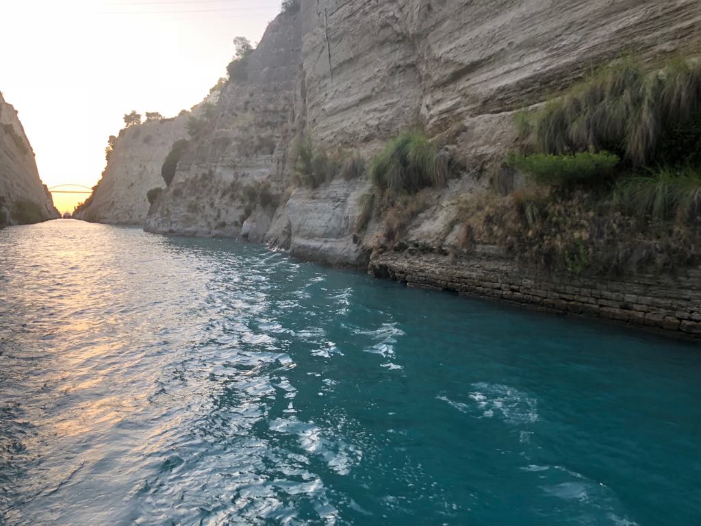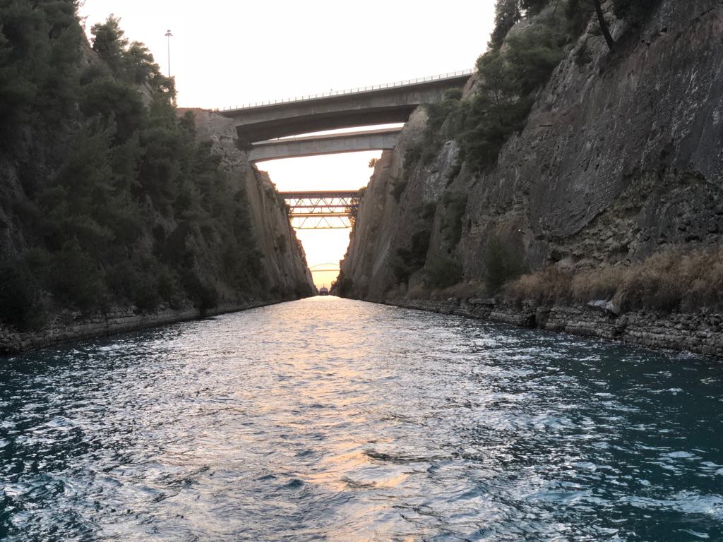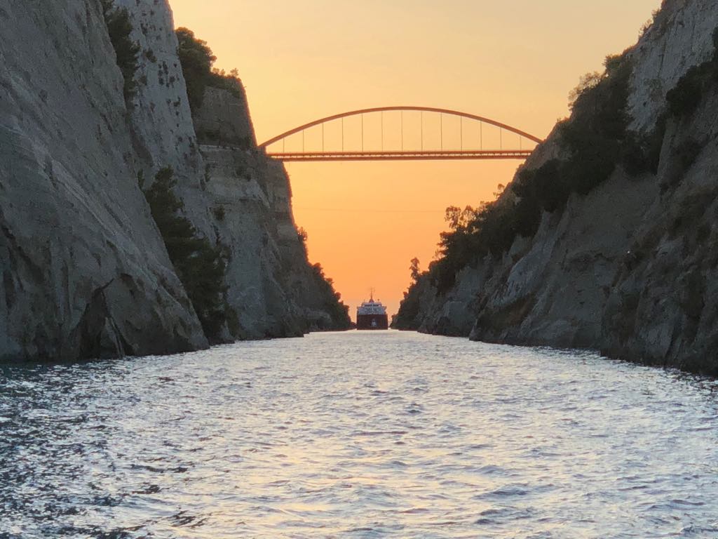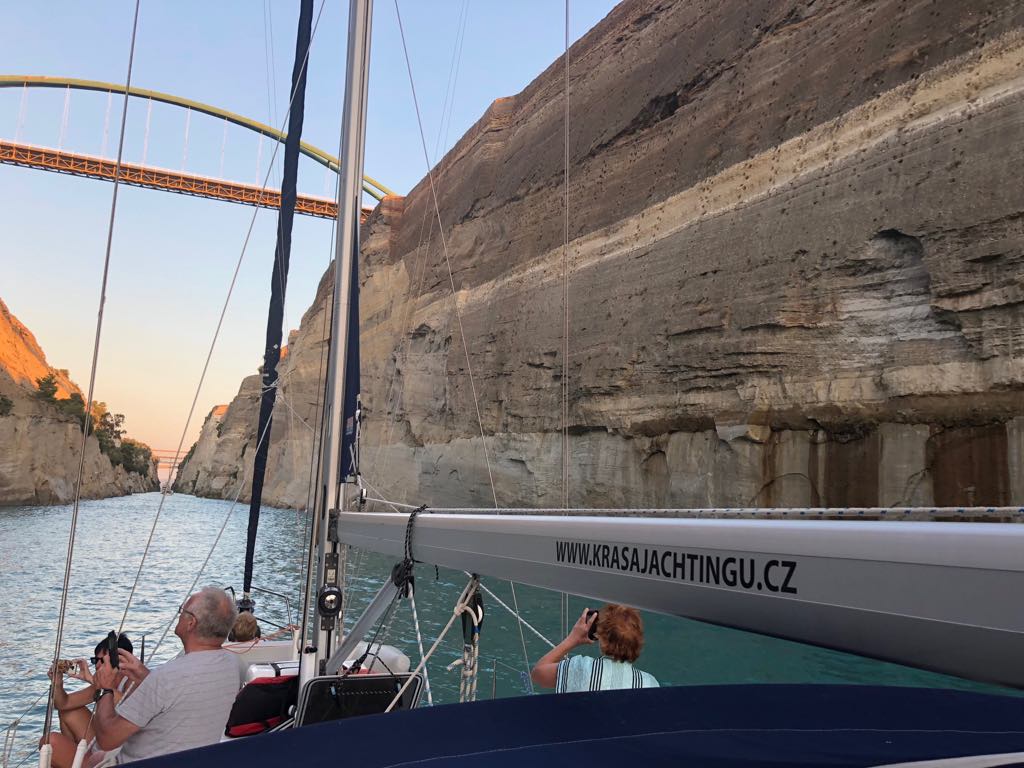 Když jsme dorazili ke Korynthu, už tam pár lodí stálo. Vysílačkou nás řízená provozu informovalo, že kanál je zavřený a otevřený bude až za dvě hodiny. Čekání se nakonec protáhlo na tři hodiny a konvoj se začal řadit se začínajícím západem slunce. Jeli jsme přeposlední. Na záda nám dýchal veliký tanker, který se do průlivou tak tak vešel. Vysílačkou nás hodně honili – „full speed full speed“ neustále volali. No jeli jsme s Gaiou a proudem nakonec 7 uzlů, což Gaia na motor nikdy nejela.