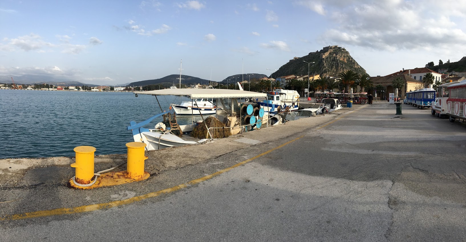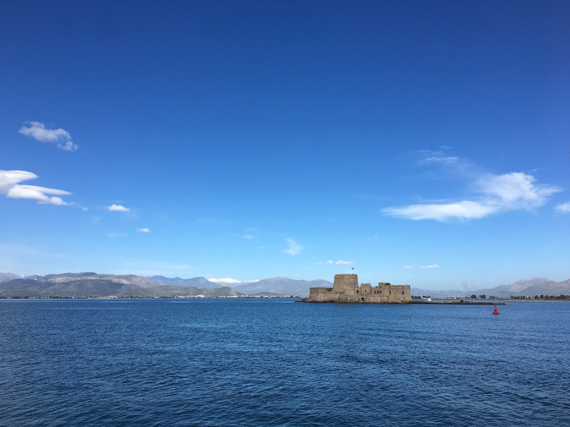Druhý den jsme vyrazili dál – podél pevniny na západ a pak na sever do Navplijského zálivu. Cestou jsme se vykoupali u ostrůvku Korakas a pak bez potíží dopluli do Navplia, kde jsme hodili kotvu u velkého mola, kde bylo spousta místa.