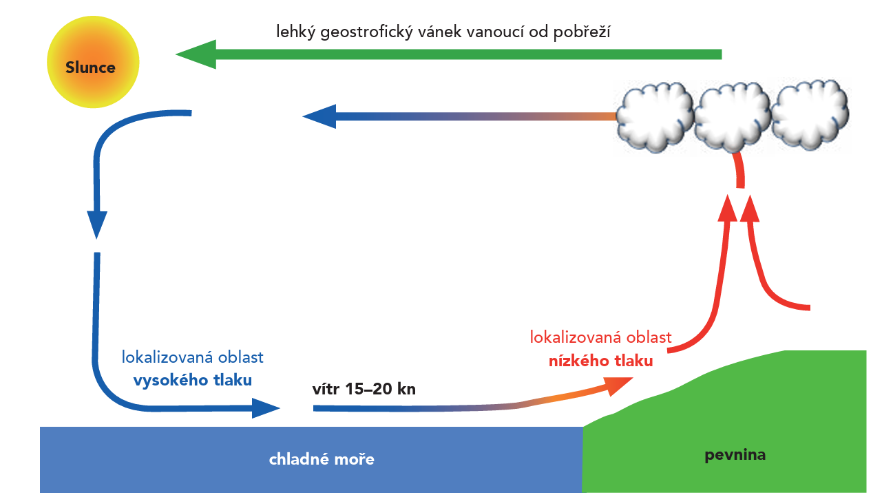 S postupujícím dnem se zvětšuje rozdíl teplot mezi pevninou a mořem, což tento proces ještě více prohlubuje. Také vlhký vzduch, který se vrací z moře nad pevninu, stoupá vzhůru a tím se vodní pára v něm kondenzuje a vytváří podél pobřeží linii kupovitých mraků (cumuly).