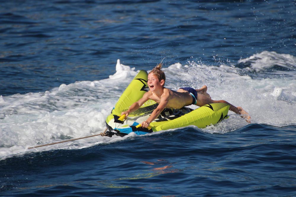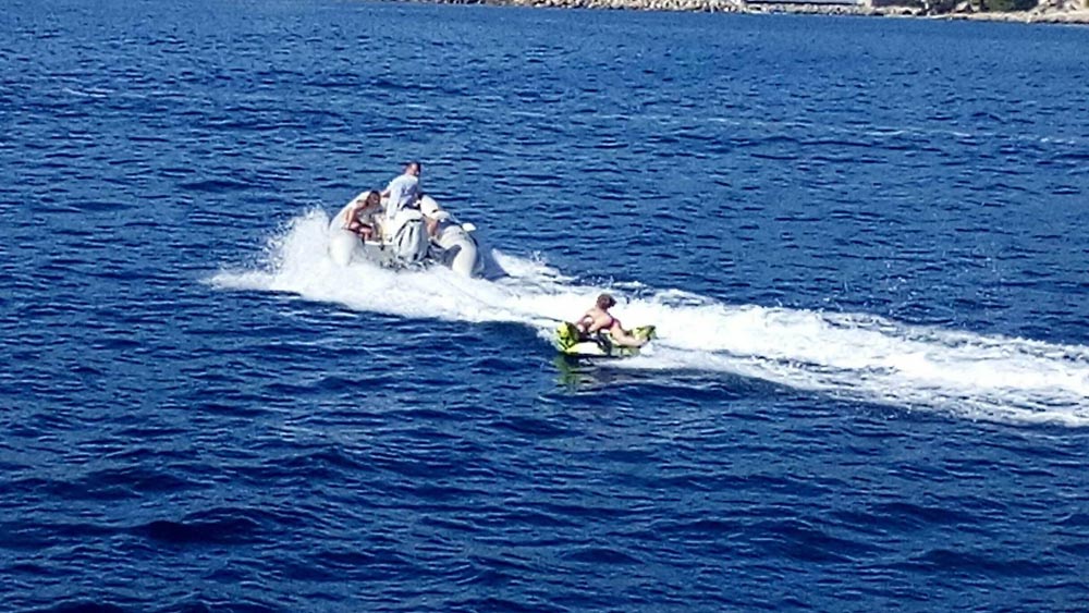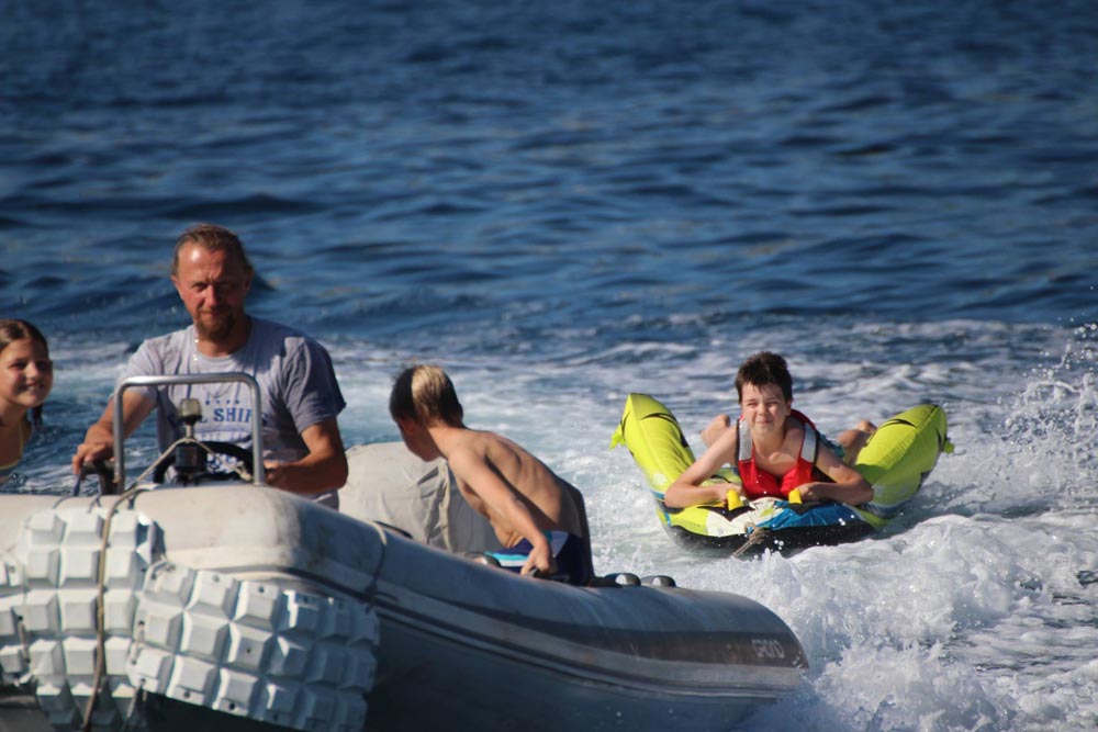 Dopoledne nefouká a tak taháme děti kolem lodi na kluzáku za člunem.