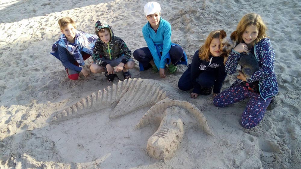 Dopoledne se skupina chrabrých dětí vydala přepadnout místní pirátský hrad. Vylezli jsme tam ale k bitvě nedošlo, protože hrad byl prázdný. Nejdříve jsme si mysleli, že jejich těla leží na hřbitově pod hradem, ale nakonec se podle nalezené mapy ukázalo, že část pirátů utekla na velké fregatě a zbytek sežral strašlivý drak. Jeho jeskyni jsme brzy objevili na jednom z protějších svahů i s ohromným kamenným symbolem kultu draka. Bylo to super. To, že tu v lese najdu symbol připomínající draka o velikosti 70 x 70 metrů jsem věděl, ale to, že naprosto náhodně se tu vyskytne v příběhu popsaný trojstežník už chce fakt velkou kliku!