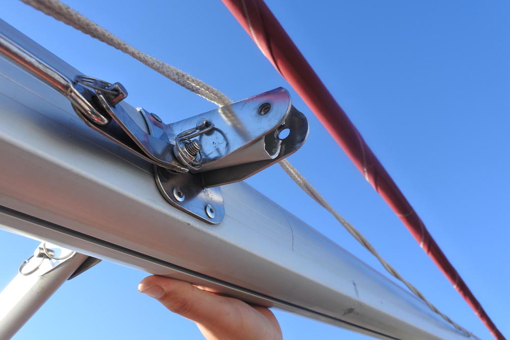 Druhý den děti se Stáňou vyrážejí na pláž a já jsem si naordinoval servisní den. V první řadě musím sundat dolů stěžeň a zjistit rozsah poškození uchycení sálingu. S mrtvým mužem to jde dobře a rychle, a tak za pár minut zjišťuji, že jediné, co musím udělat, je zkrátit ulomený sáling o pár centimetrů a vyvrtat do něj nové díry. Všechno jsem si obkreslil na pahýl sálingu a jdu shánět, kde mi to kdo navrtá.