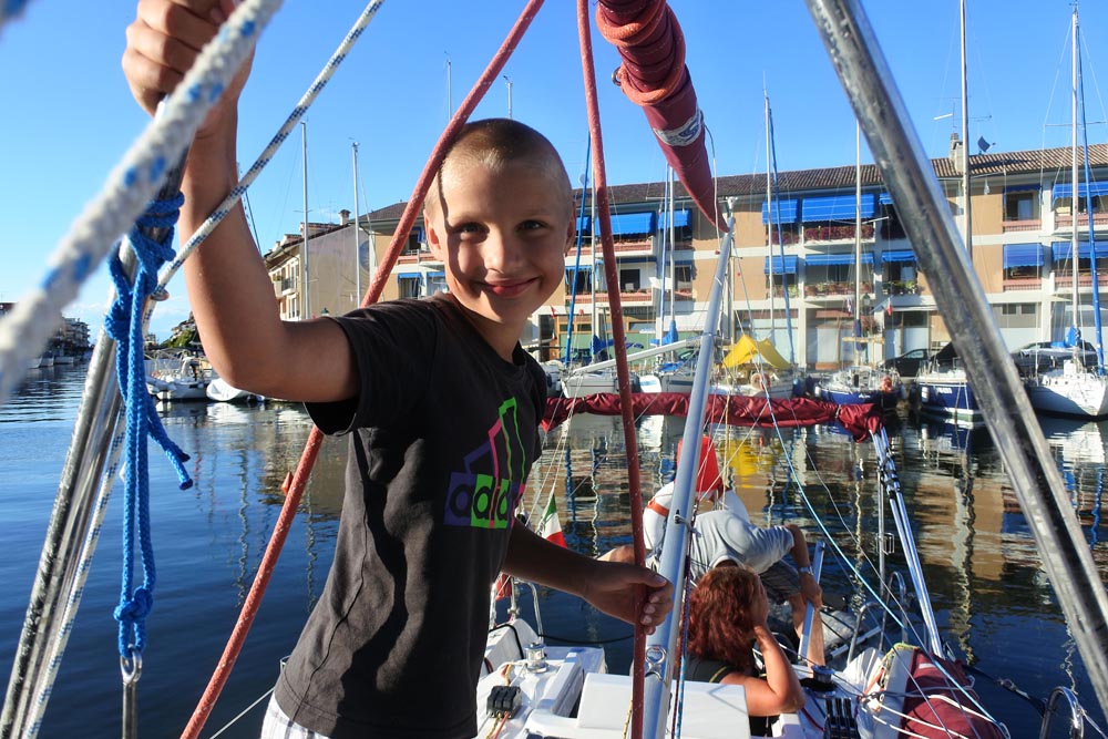 Na palubě celý týden probíhá čtení na pokračování z knihy Arthura Ransoma Záhadné vody. Přeci jenom je třeba ty děti trochu masírovat, aby měly vztah k plachtění a vodě vůbec. Jinak bych to tady mohl zavřít a jezdili bychom třeba do Bibione na pláž pod deštník. Děti se rozhodly, že dají do člunu baterii, elektromotor, vezmou si tužku a blok a pojedou mapovat kanály a okolní vodu vůbec, stejně jako hrdinové rozečtené knihy. Voda je tu krytá a nic jim nehrozí, jenom je upozorňuji na proud, který by je mohl teoreticky někam odtáhnout. Dostávají zásobu vody, sušenek a vysílačku. Mají rozkaz být stále v kontaktu a stále musí vidět stěžeň mateřské lodi. Odplouvají, to je najednou klid. A tak zatímco na palubě probíhá lenošení, vaření a čtení, děti zuřivě mapují, abychom pak porovnali jejich výsledek s reálnou mapou. Nadšeně připlouvají asi po dvou hodinách a hlásí, co všechno kde objevily.