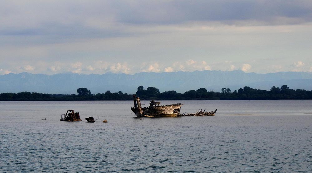 Servisní a válecí den máme za sebou a zítra ráno vyplouváme na jih podél italského pobřeží do Bibione. Vstáváme v sedm hodin. Je krásný den a ty tam jsou chorvatské bouřky. Vyplouváme z města rybářským kanálem a oproti míjíme rybáře, co se navrací z moře. Že byl úlovek bohatý poznáme podle hejna racků, kteří pronásledují takto naplněnou loď a pochutnávají si na rybách a vnitřnostech, které rybáři házejí do vody. Racci je chytají ještě za letu a náramně se u toho rvou a skřehotají. O kus dál vidíme dva prastaré dřevěné trupy lodí, které ztroskotaly dávno na mělčinách a vítr a moře je postupně demontují. Ještě pár let a zmizí úplně.