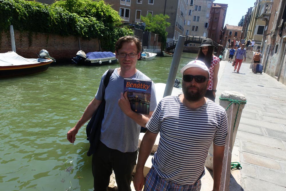 Telefonujeme Nojmikovi a navádíme se do stejného kanálu jako je on. Po chvilce ho spatříme. Jééé, to neuvěřitelné, ale bez problémů jsme se shledali. V pěti lidech člunem dál pokračovat nemůžeme, a tak se rozhodujeme cestu dále absolvovat pěšky. Přivážeme člun v jednom kanálů k zábradlí a jdeme se prodírat uličkami. Kdyby člověk omdlel vedrem, tak snad ani nespadne na zem. Je to tedy veliký masakr. Lidí všude tolik, že některé ulice jsou dost nacpané a v proudu lidí se nejde ani zastavit. Na důkaz dobytí Benátek zakupuji prastarou vlajku Nejjasnější benátské republiky.