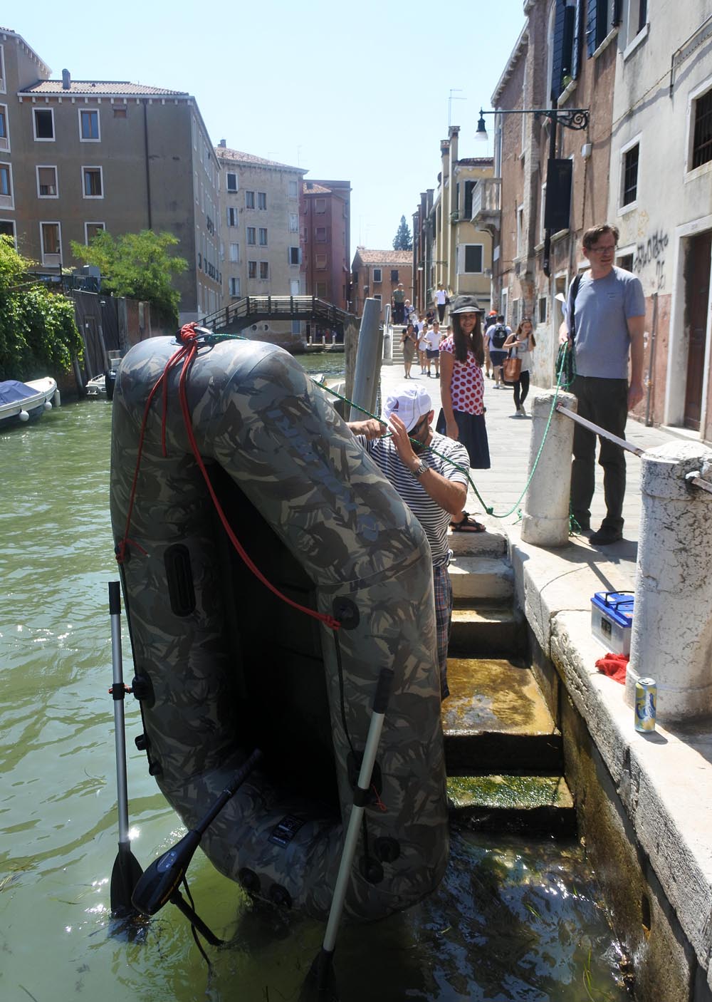 Potřebujeme urgentně dobít baterie, protože solár na střeše je poškozený. Připojíme tedy elektřinu a ještě zesílíme naše uvázání na kůlech. Dobrou hodinu nepřichází nikdo, kdo by nás chtěl vyhodit. Na loď pověsíme ceduli s telefonním číslem, kdyby přišel majitel stání. Sbalíme si fidlátka, nastrojíme člun a odpoutáváme se od Lente. Musíme přejet hlavní kanál v nafukovacím člunu, no mírně řečeno přetíženém. Vyčkám, až se situace na hladině trochu uklidní a vyrazím na plný výkon našeho 55librového elektrooslíka. Vlny nás hustě skrápí a lomcují s námi do všech stran. Je to sice jen blbejch 200 metrů, ale nekonečnejch. Holky si vzaly do města krásný nový šatičky, ale už teď jsme docela mokří. Nevadí, stejně je horko. Přeplujeme kanál a šup do bludiště menších kanálů. Kolem nás gondoly, taxíky, nákladní loďky se sutí a mezi tím my na maskovaném vyloďovacím gumáku.