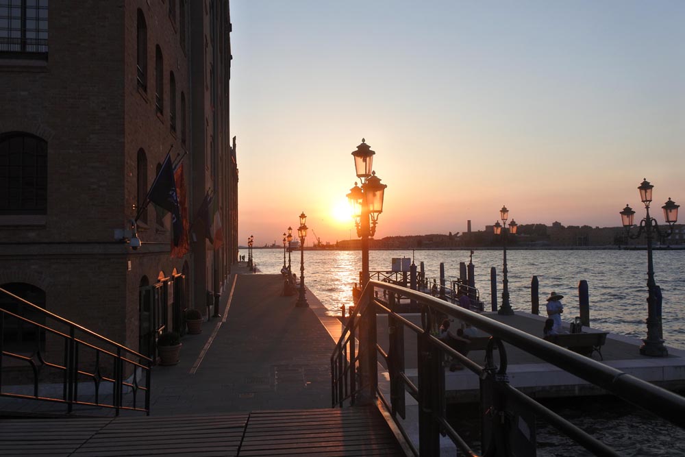 Po večeři beru foťák a jdu se projít po okolí. Ostrov Fisola je v podstatě takové normální místo prakticky bez turistů, kde potkávám lidi jdoucí z práce, kluky kopající na ulici fotbal a mámy s nákupními taškami, jak se zmožené vedrem plouží domů uvařit špagety. Grafiti na stěnách, prádlo na balkónech a občas bordel na ulicích. Prostě taková normální Itálie protkaná místo silničkami sítí kanálů. Jsem za tu všednost vlastně rád. Slunce zapadá a zlatí oblohu se siluetou Benátek, procházím se po nábřeží. Po krátkém přemlouvání lenochů z lodi se připojí i Verda a Stáňa. Společně pak do noci brouzdáme uličkami, jíme zmrzlinu a bloudíme v benátských Stínadlech. Na nábřeží jsou restaurace plné lidí krásně oblečených a navoněných. Jenom my tu tak kráčíme ve stokrát propocených a prosolených hadrech, s vlasy rozcuchanými větrem a slepenými solí. Jsme ale spokojeni. Sedíme na schodech katedrály svatého Eufemia a užíváme si večerní chlad. Dokonce jsme potkali jakýsi institut Jana Palacha. Zvláštní, na co tu člověk nenarazí.