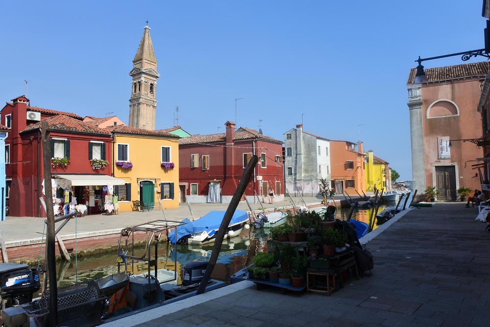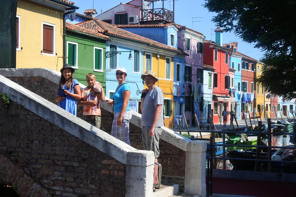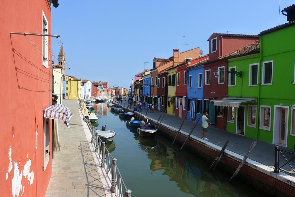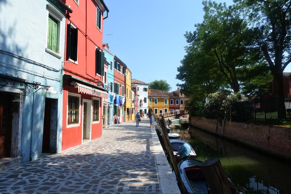 Buráno je nádherně křivolaké a neuvěřitelně barevné. Nízké domky, malé mostíky, všude oranžová, modrá, červená barva, připadám si jak někde v Mexiku. Malíři by měli radost z té záplavy barev. Tady bych taky chvilku vydržel. Turistů velmi málo, spíše je to ospalá roztomilá díra. Vlastně se shodujeme na tom, že ostrovy Muráno a Buráno jsou mnohem přívětivější a krásnější než přeplněné Benátky. Chodíme po uličkách a jenom tenká záclona u vstupu do domu dělí život na ten veřejný pouliční a domácí. Určitě by se vyplatilo navštívit i ostatní desítky ostrovů v laguně, ale na to nemáme bohužel čas.