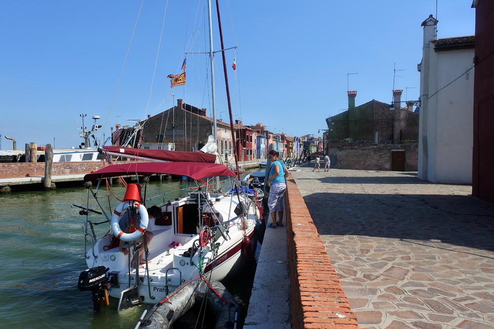 Nojmik je čerstvý a nenabažený kormidla a moře, a tak nám to vyhovuje, že se tak povalujeme po palubě a v podpalubí a jenom hledám v navigaci cestu na ostrovy. Míjíme ostrovní hřbitov a dokonce na chvíli i vytáhneme genu a plachtíme k ostrovu Muráno. Je brzy ráno a my vplouváme do hlavního Muránského kanálu, na dvou místech nám řeknou, že zde přistát nemůžeme, ale pak usměvavý Ital poradí, kam se můžeme vyvázat. Přistaneme bokem na hlavním nábřeží přímo v centru. Je to tu nádherné, romantické a křivolaké.