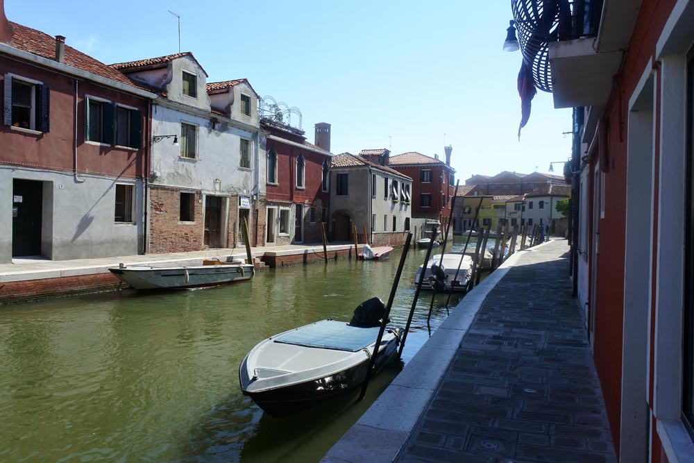 Ihned vyrazíme na průzkum okolí. Je zde sklárna na sklárně. Nelákají mě ty turistické cetky, ale chtěl bych vidět mistry při práci. Šmejdíme a ptám se, kde je možné vidět skláře jak dělají barevné sklo. Po nějakém čase se s Lukym dostaneme do sklářské manofaktury, kde pozorujeme skláře, no v podstatě jako v Harrachově, akorát dělají s barevným sklem. Lodě vozí kanály různé zboží a často právě plynové láhve do sklářských pecí. Čím tady ale topili dřív nemám tušení, stromy tu v podstatě nejsou a nikdy asi pořádně nebyly. Nedá nám to a nakonec pár těch skleněných cetek pro holky nakoupíme.