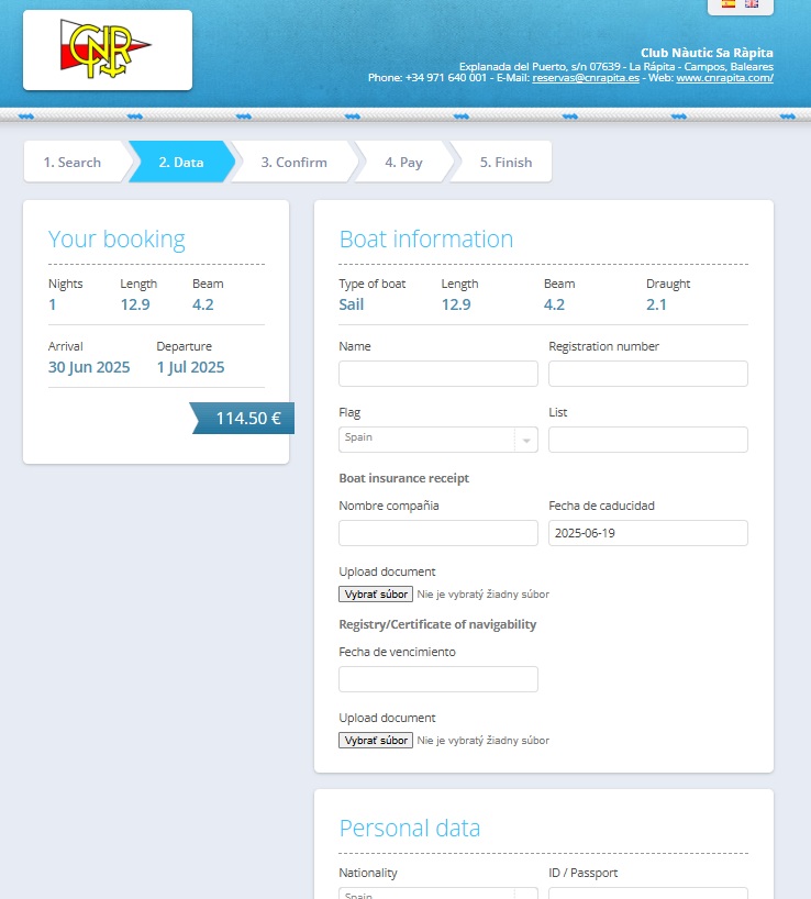 Rezervace probíhají přes webové stránky jednotlivých marin, někdy jen ve španělštině. Není třeba se bát, samotné rezervační formuláře, jakmile se k nim proklikáte, většinou nabízejí i angličtinu. K rezervaci budete potřebovat údaje o lodi (název, typ, rozměry), své skipperovské údaje a pozor – údaje o vlastníkovi lodi, číslo pojistky a tzv. „list“ – registrační kód, který musí mít ze zákona všechny lodě pod španělskou vlajkou.