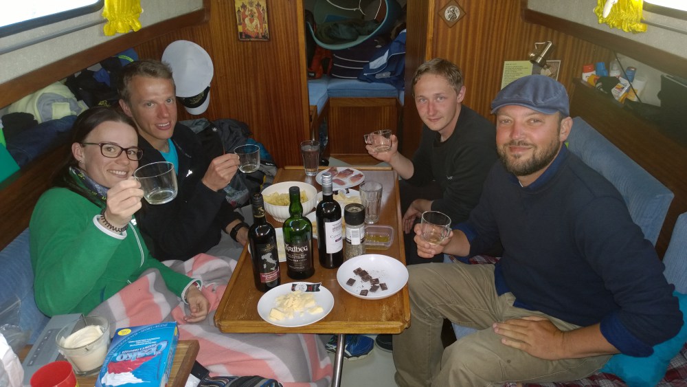 Dostal jsem dárek – v jednom místním obchůdku mají unikátní Islay Malt Whiskey – míchají ji specilně pro ně. Jmenuje se Cragabus a je to těžká fáčovina. Tak to miluju. Bože. A k tomu dva pytle vážených bonbonů! V místním Pivovaru jsme nakoupili asi 5 druhů piva a šli je ochutnat na chytání ryb. Nic jsme nechytili, ale perfektně si to užili. Na večeři jsme šli na pizzu a pomalu se připravili na noční plavbu. Kolem půlnoci mělo přijít okno v počasí, které nám umožní odplout. Čeká nás 20 hodinová plavba na Sylt. Dostal jsem spoustu zpráv a přání – ani nevíte, jak požehnaný se cítím tím, že mám tak skvělé přátele. Děkuji vám!