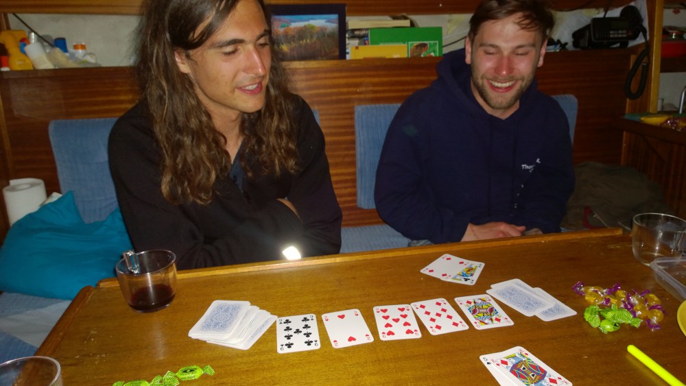 Když odpoledne přileji oba Jakubové, bylo podle předpovědi jasné, že si po cestě moc neodpočinou. Vítr měl v noci foukat hodně zepředu, ale na Helgoland by nás měl pustit. Další dny se mělo počasí zhoršit, takže jsme vyrazili do úžasného západu slunce, ostře přoti jihovýchodní pětce. Na Helgoland to bylo 85mil, a za světla vzdálených majáků začalo poprchávat. Loď byla nakloněná až skoro příliš a postupně se začaly zvedat i pěkné vlny. Pro kluky to musel být docela křest ohněm. Kolem půlnoci jsme s Kubou převzali hlídku a konečně měli po dlouhé době čas pořádně popovídat. Za lodí se táhla brázda světélkujícího planktonu. Asi po dvou hodinách jsme potkali osamělé světélko jediné plachetnice, kterou jsme tu noc potkali. Zdálo se v dešti být až prazvláštně nehybné a stabilní, a samozřejmě jsme se na celém tom širém moři naprosto těsně minuli. Kubu jsem nakonec poslal dolů si trochu odpočinout, i když v tom náklonu a ranách z vln to asi moc nešlo, a zůstal na palubě až do svítání sám. Zpíval jsem si a pozoroval světla větrných farem a kardinálních bojí, co je ohraničovaly. Pluli jsme stále ostře proti větru, ale naštěstí jsme se obešli bez réčkování. Nakonec jsem za kormidlem několikrát usnul, tak jsem se nechal vystřídat Brandonem s Jakubem. Po několika hodinách jsme se přiblížili nadohled majestátním útesům deštivého Helgolandu. Proti nám ostrovy opouštělo přístav několik plachetniček. V přístavu bylo nacpáno a lodě raftovali v 6 i více řadách. Naše, suverénně nejmenší, lodička by se mezi ostatními asi docela ztratila, ale naštěstí nás po chvíli kroužení pozvali k prstovému klubovému molu. Sice tam byl za odlivu přístup asi jako po uzké pěšině, ale s díkem jsme přijali.