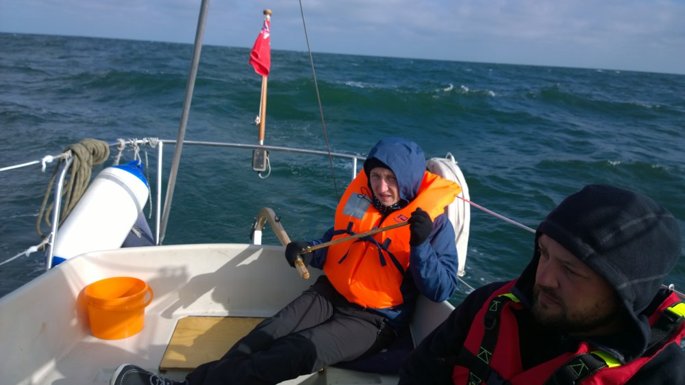 V noci jsme se šli podívat na vlnolam – dmutí severního moře bylo impozantní … o trochu varovné. O půlnoci jsme opustili bezpeční přístavu a vypluli vstříc vysokým vlnám, rudému obzoru, nic moc zadním větrům a 80M cestě na Německé hranice. V cestě máme 20M dlouhý podmořský útes Horns Rev. Tušil jsem, že pri současných vlnách bude v průplavu v něm asi docela docela veselo. Celou noc a den nám moc nefoukalo, vlny do zadnice a slabý vítr jakbysmet činily z plavby utrpení. I pro plachty. Horns Rev naplnil mé obavy, když zvedl již tak vysoké vlny a notný kus výše a zkrátil jejich vlnovou délku, takže plavba pripomínala jízdu na sbíječce. No po několika hodinách jsme byli rádi, že byl útes za námi a dokonce se zvedl vítr, takže jsme konečně upalovali k Syltu. Nutno říci, že posádka byla výborná. Zvlášť Brandon, ze kterého je po těch pár týdnech námořník jedna báseň. No a ve vlnách se všichni i připojili do exkluzivního kýblového klubu. Kýbl nám dokonce i uplaval, takže jsme měli MOB cvičení.