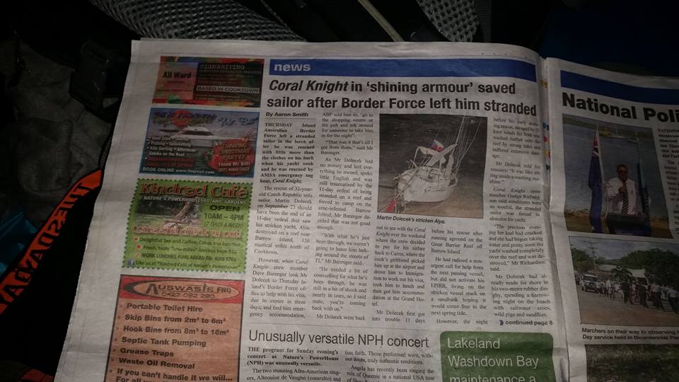 Po opuštění záchranářské lodi Martin se Martin usadil na čas v Cairns, kde bydlel pár dní v hostelu a snažil se s místními úřady dojednat záchranu lodě. Kromě velké vzdálenosti vše komplikovala i skutečnost, že Alyia uvízla v národním parku, a známe úřady, že. Situace se nijak nevyvíjela a čas pracoval proti Martinovi. Jak dlouho může Alya na písku vydržet?