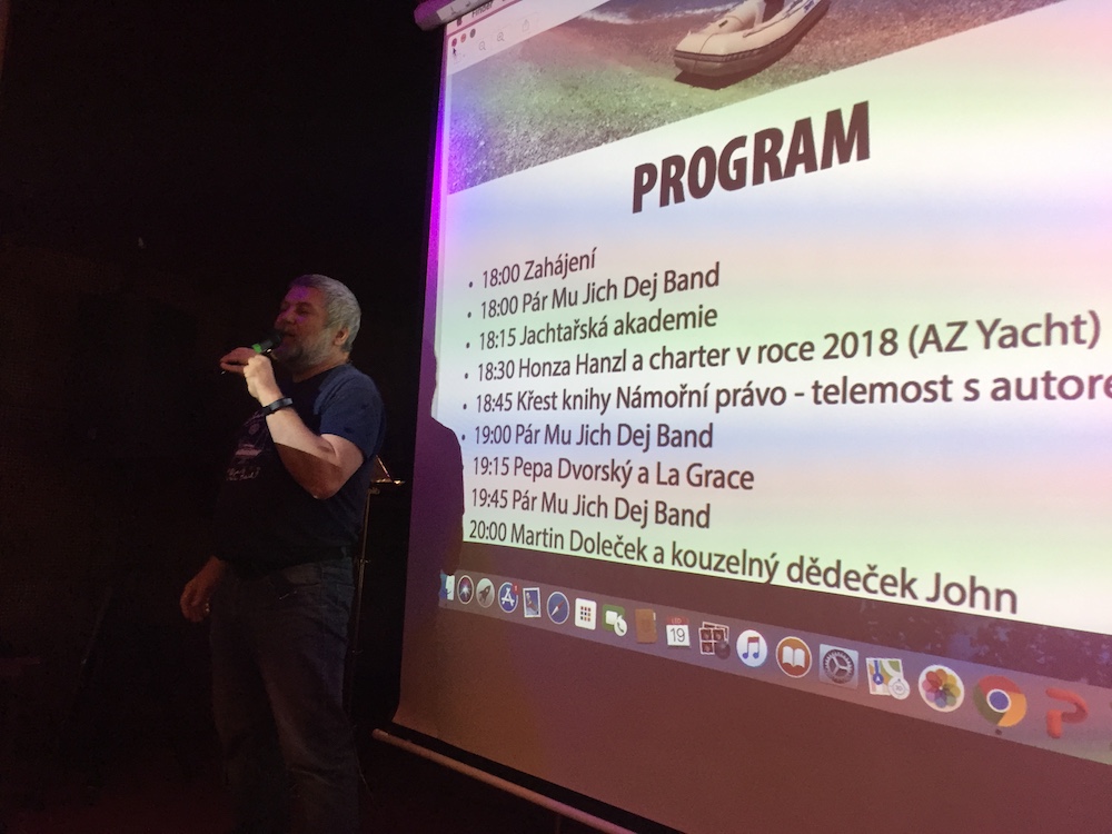 Následovalo povídání o charteru v roce 2018 od Honzy Hanzla (AZ Yacht). Honza zprostředkovává plavby prakticky po celém světě a jeho povídání bylo zajímavé. Třeba o tom, proč je dobré pojistit si kauci a jak se stále více půjčují katamarány. Honza byl zárověň kmotrem knihy Námořná právo očima jachtaře, která vyšla v našem nakladatelství IFP Publishing před Vánoci a jejímž autorem je známý jachtař Pavel Burkert. Pavel se pohříchu nemohl křtu zúčastnit, protože zrovna školil na Slovensku budoucí kapitány, a tak jsme museli realizovat telemost. Telemost v podobě mikrofonu a mobilního telefonu zafungoval na výbornou, a tak nebyl nikdo v sále ochuzený o Pavlův proslov. Nakonec jsme knihu dostatčeně pokřtili šampaňským – jeho konzumaci ovšem Pavlovi už telemost nezprostředkoval. 🙂
