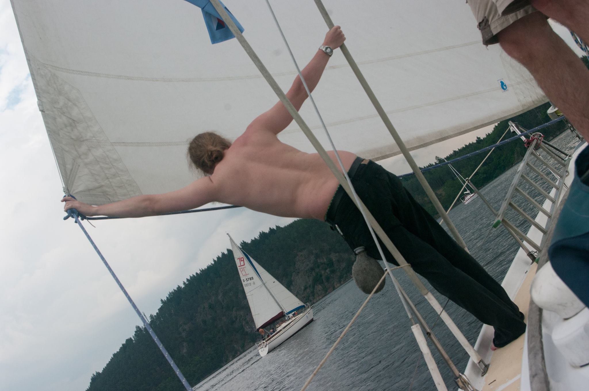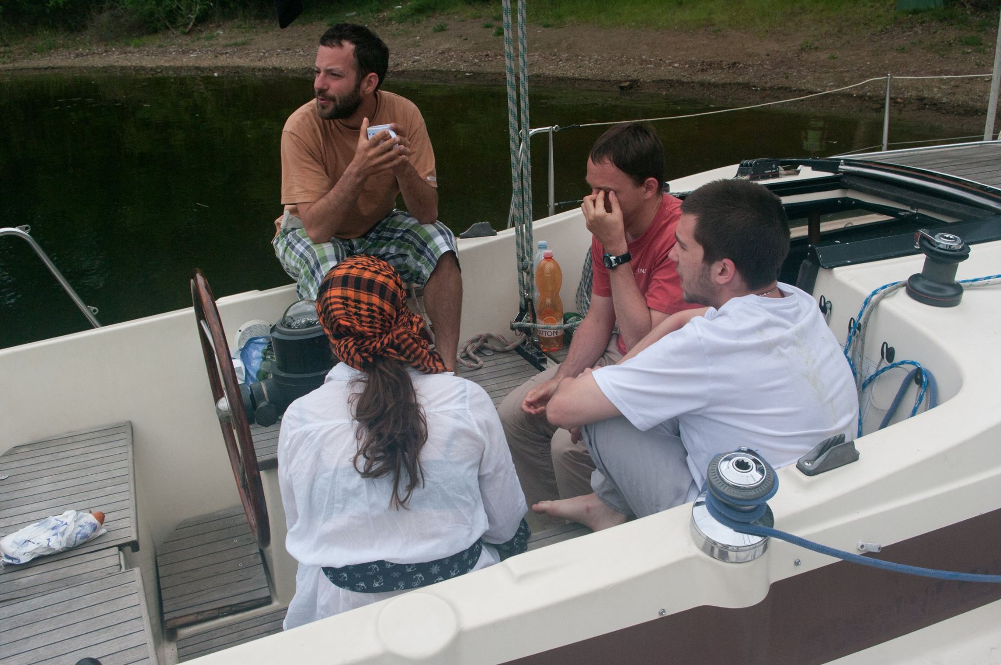 Plachtili jsme takhle celé dopoledne, ve 12 jsme začali vařit oběd, samozřejmě se okamžitě více rozfoukalo a na boční vítr jsme měli i náklon (k radosti kuchaře). Zrovna kormidlovala Verča a na to, že byla na lodi poprvé, zvládala kormidlování na motýla i halzy výborně. Ona vůbec celá posádka se hezky vycvičila již za sobotu a já měla i čas jít si sednout na příď nebo pomoct s obědem.