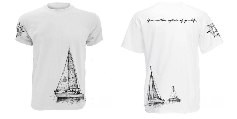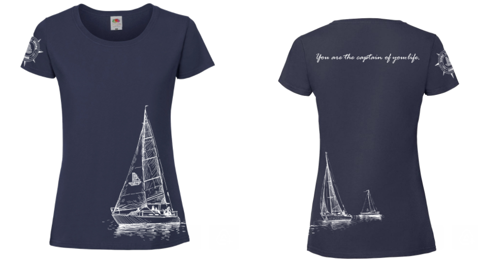 Design jsem vymýšlela tak, aby oblečení bylo nositelné nejenom na palubě lodi na plavbách, ale aby bylo slušivé i v běžném životě nebo do práce. Potisk ručně kreslených plachetnic tím pádem není na středu trička, jak tomu bývá zvykem, ale na boku. Na rameni je poté kombinovaná kompasová růžice s uzly a na zádech nápis „You are the captain of your life.“ Protože to je přeci největší pravda. 🙂