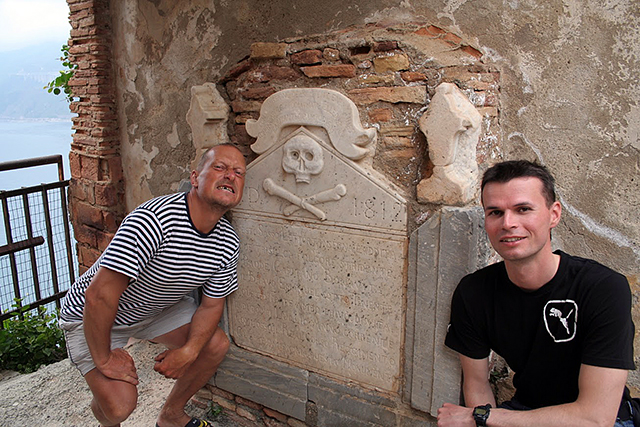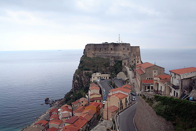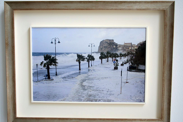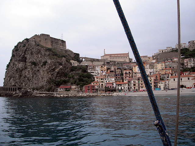 Šplhali jsme serpentýnama silničky, která vedla mezi domy až k radnici, kde jsme si dali zmrzlinu. Cestou jsme obdivovali výhledy na Princeznu, která kotvila mírumilovně hluboko pod námi. Nevynechali jsme ani starý hrad na skále, (1,5EUR vstup), který zde stojí od nepaměti a v poslednícj letech, než jej zpřístupnili veřejnosti, sloužil jako vojenský objekt. Výhledy na Sicílii jsou odtud jedinečné. V objektu je také dnes výstavní síň, kde jsme narazili na fotografii, jak to tady také může vypadat, když se moře rozčílí.