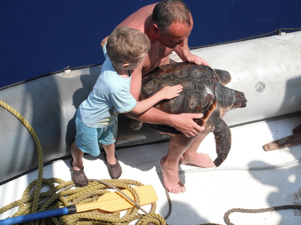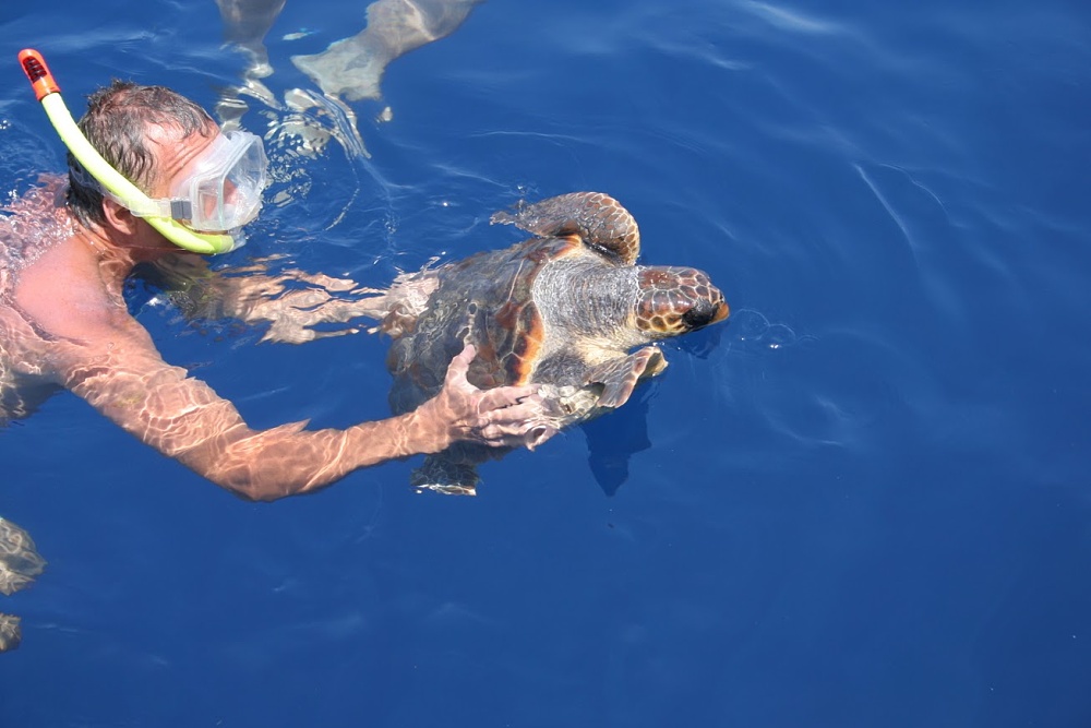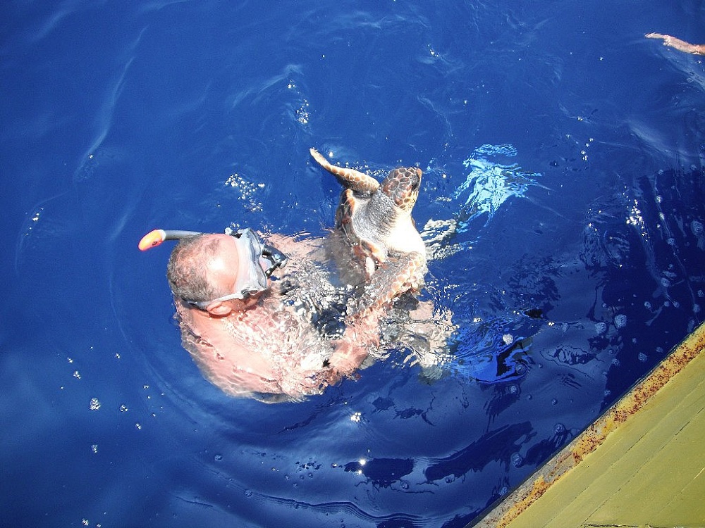 A skutečně, za chvíli se vynořil a v náručí svíral krásnou mořskou želvu. Zastavili jsme loď, polovina posádky naskákala do vody a všichni obdivovali krásného mořského tvora. Musela si připadat jako hvězda, tolik focení a prohlížení… Byl to nádherný zážitek. Nakonec jsme jí pustili a ještě dlouho sledovali, jak mávajíce ploutvemi mizí pod vodou a v modré hlubině.