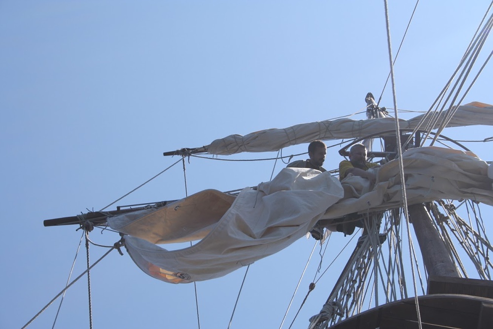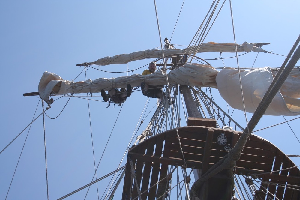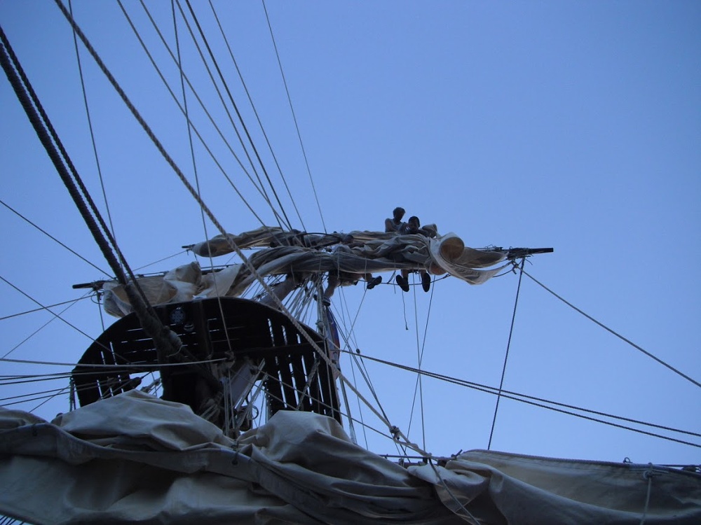Ovšem nevylezli jsme sem pro parádu. Bylo třeba se postavit na šlapnice- to jsou taková ta lana, co vedou pod ráhnem, vydat se na konec ráhna a uvolnit gaskety, což provazy držící plachtu sbalenou. Takže se postavit na šlapnice, přehnout se horní polovinou těla přes ráhno, přesunout se na konec ráhna, TAM SE PUSTIT OBĚMA RUKAMA a těma volnýma rukama manipulovat s gasketkou. Uvolnit jí, smotat do panenky (aby nevlála a nekousla se náhodou v něké nějaké kladce) a posunout se k další. A to vše na košovém ráhně asi 17 metrů vysoko za vytrvalého houpání. No nějak jsem to zvládl, hlavně za neutuchajících rad Vikiho a vrátil se ke stěžni. Uf.