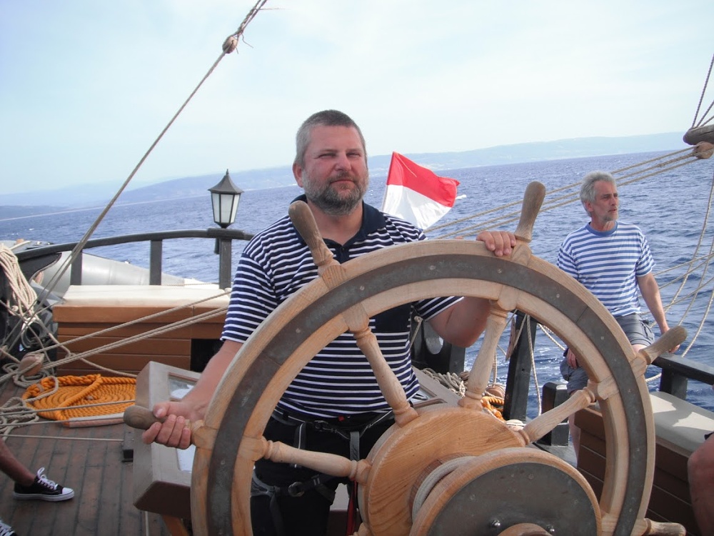 Při službě u kormidla mám na sobě vestu a jsem připoutaný. Loď se střídavě vzpíná a propadá na vlnách, které dosahují čtyři metry. Voda cáká přes příď a všechny paluby jsou mokré. Je to neuvěřitelný zážitek. V noci vítr mírně zeslabuje, ale vlny chodí větší. V kajutě je problém udržet se na posteli, která se pod člověkem neustále někam propadá.