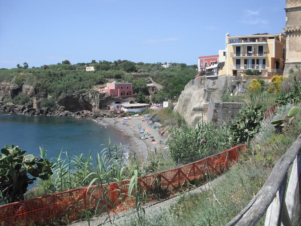 K Ponzu je díky skalám na pobřeží velice pěkný příjezd. Římské lázně jsou viditelné hned z moře a za nimi za ostrohem se krčí stejnojmenné městečko. Hodili jsme kotvu v zálivu naproti přístavu za skalou a vyrazili plenit a loupit na našem nafukovacím Zodiaku.