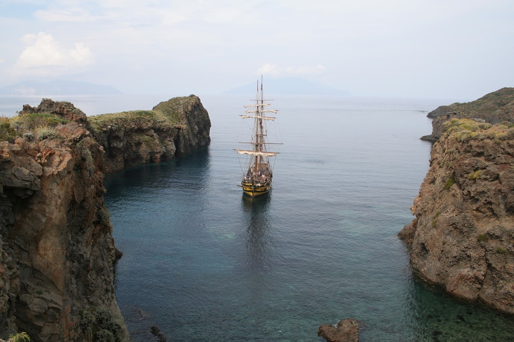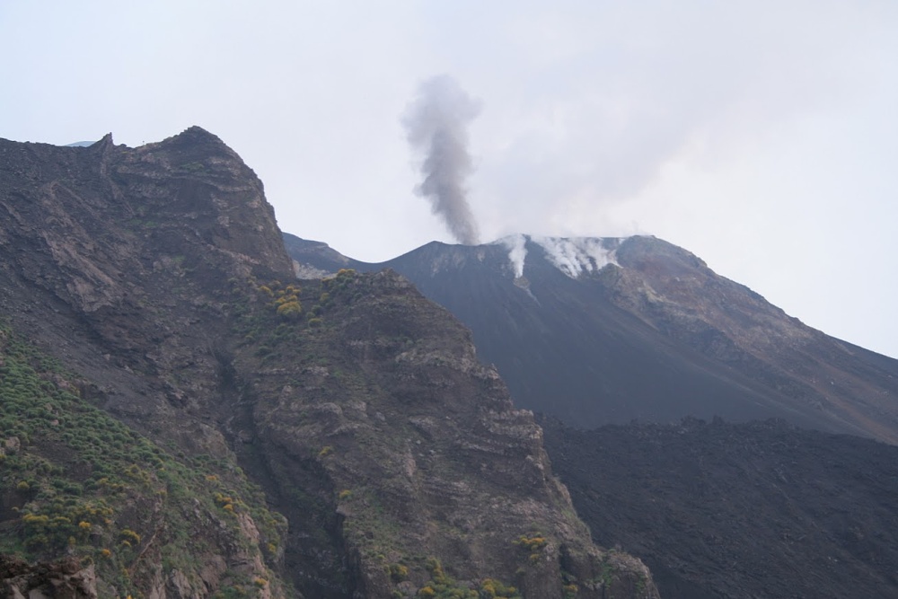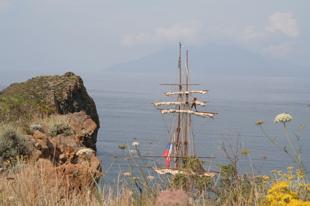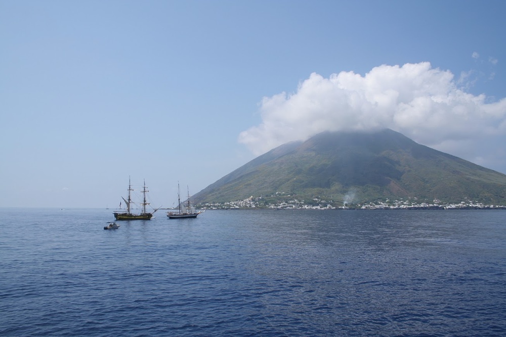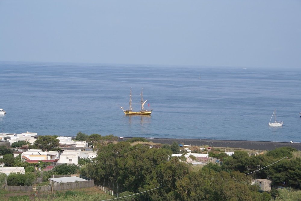 Nestačil jsem ovšem ani vybalit a LaGrace zvedá kotvu a míří na Stromboli, což je činný vulkán liparského souostroví. Z Panarey je to na Stromboli kousek a tak ještě v zátoce Cala Junko pořizujeme s Kocourem ze břehu fotografie LaGrace. Pak již kapitán bere kurs na Stromboli. V plánu je zakotvit u městečka San Vincenzo, vylodit se a pokusit se dobýt kráter sopky.