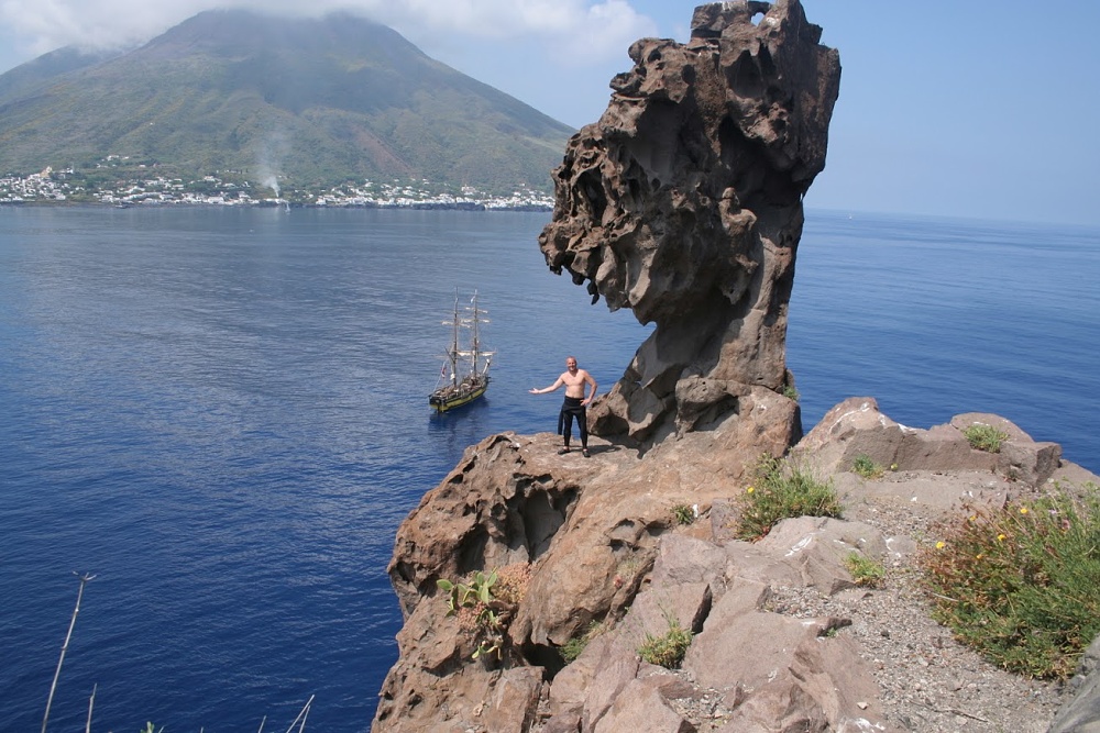 Kapitán Pepa Dvorský pod kobylí hlavou na Strombolichiu, v pozadí samozřejmě La Grace a Stromboli.