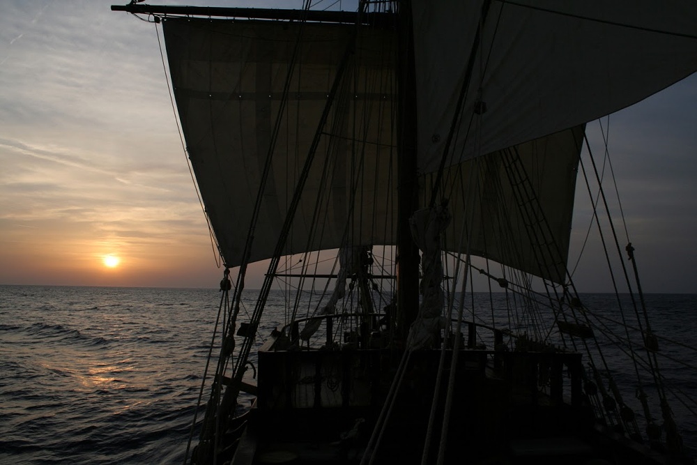 U snídaně zajímavá věc – nemohli jsme se dohodnout, jestli je úterý nebo středa. Nikdo neměl ani hodinky, ani mobil… Vlastně je to dokonalý pocit. Jsem už skoro tři týdny na moři a dny nebo čas jsem úplně přestal sledovat. Vstáváme, když vyjde slunce, nebo když zapíská bocman. Jíme, když je hlad a když kuchař udělá jídlo. Spát chodíme, když slunce zajde. Jen když se drží hlídky, tam se čas hlídá, jinak ne. Je to neuvěřitelné svobodný pocit. Televize? Noviny? Zprávy? Politika? Pche. Nic takového není a vůbec to nepostrádám. A navíc už jsem shodil 4 kila. Ty ranní rozcvičky s klikou mi vyloženě svědčí.